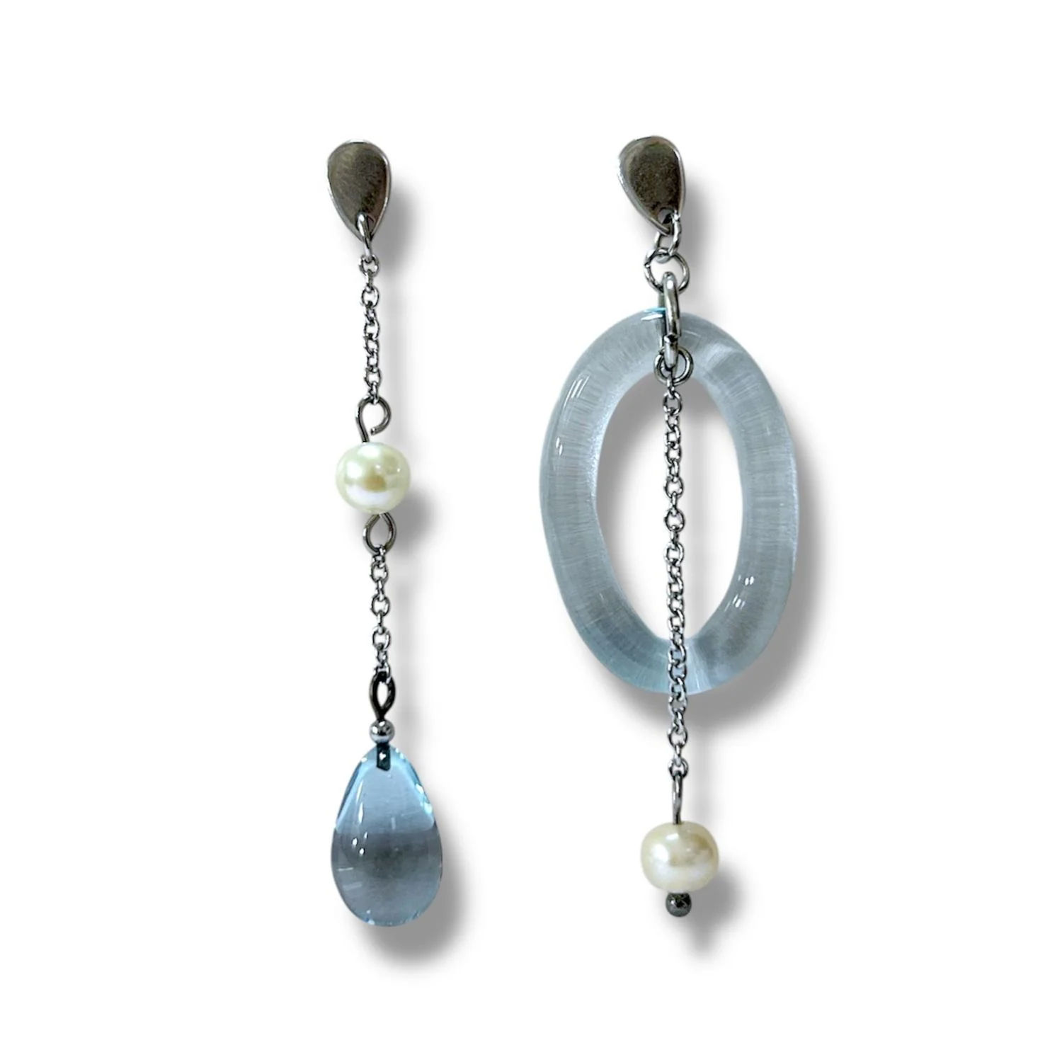 Стеклянные асимметричные серьги от бренда Lampjoy в голубом цвете из стека.
