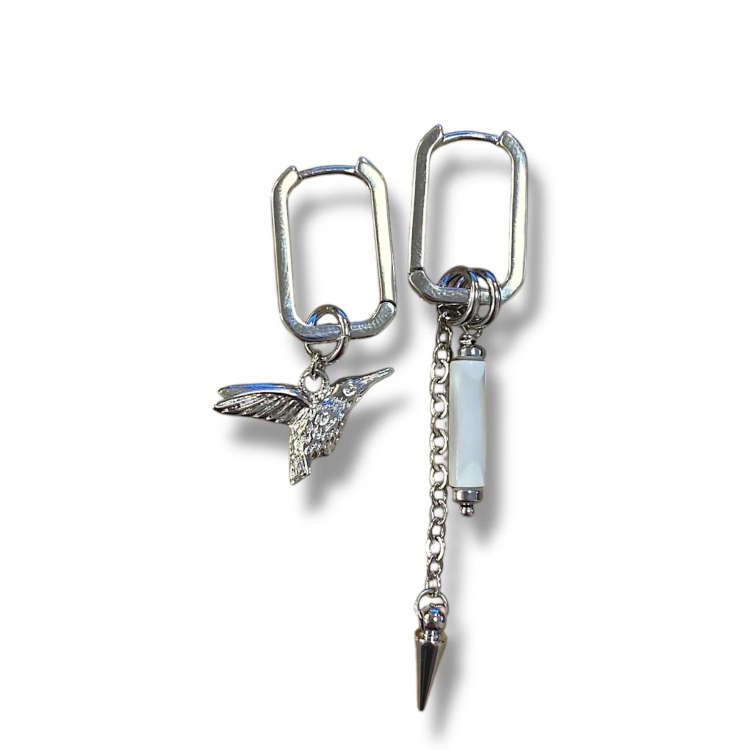 Асимметричные серьги-конго Бур.Мур «Колибри и цилиндр», родированная латунь, перламутр