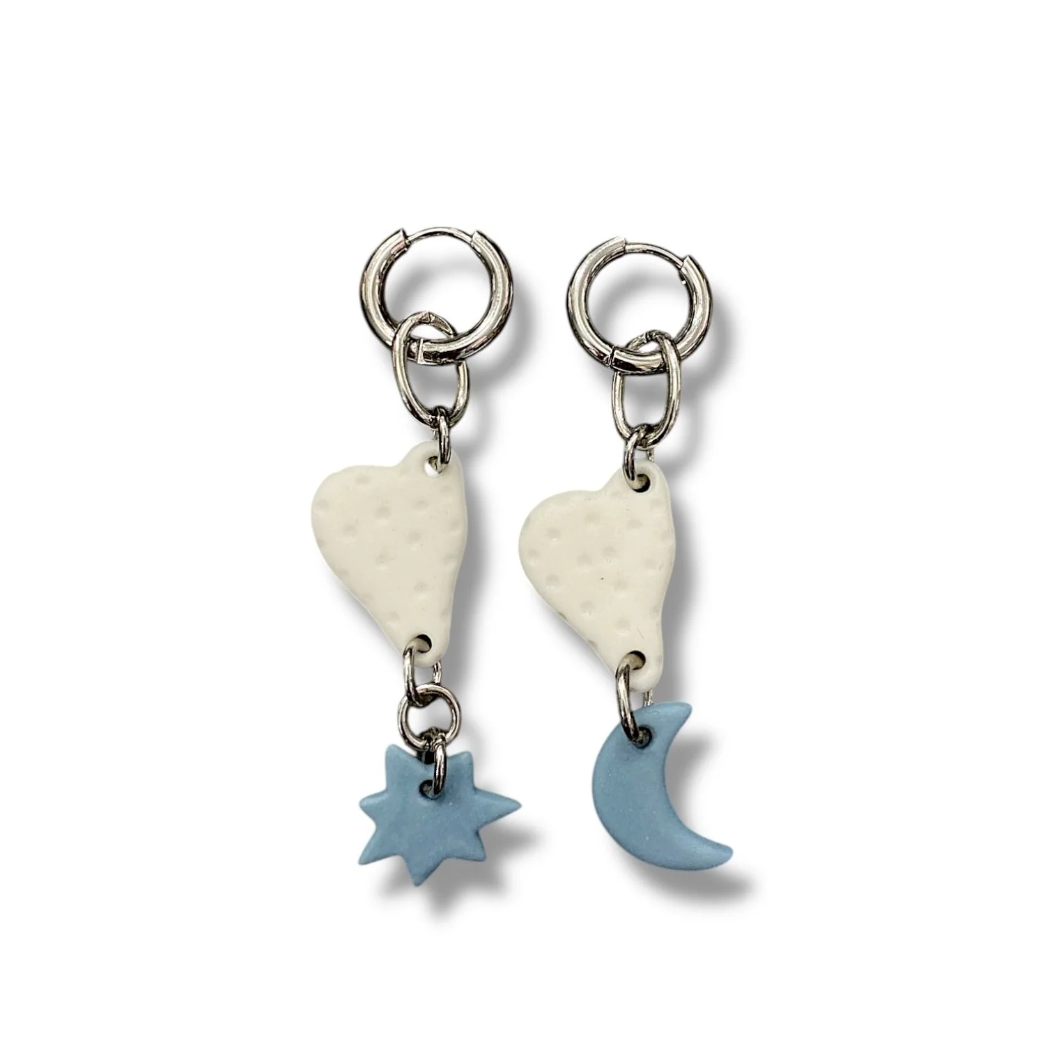 Асимметричные серьги-конго с подвесками из фарфора в форме сердечек, луны и звезды. Ручная работа от бренда North Garden.