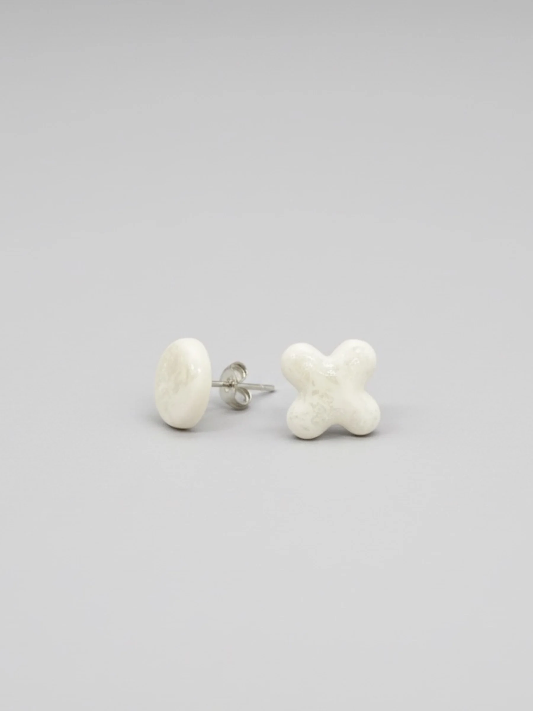 Ассиметричные серёжки-гвоздики «Цветок и кружок» выполнены из высококачественного фарфора и украшены белым перламутровым покрытием.