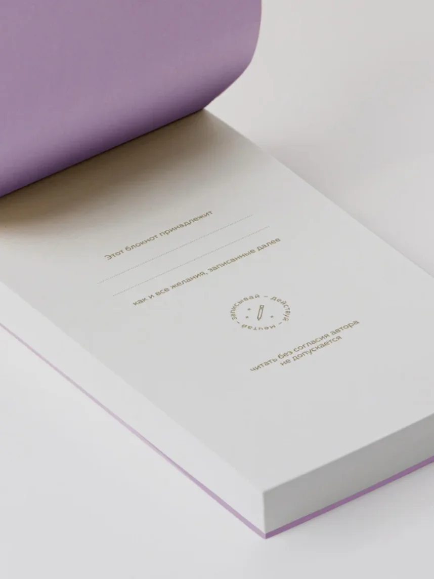 Он имеет однотонную обложку с яркой красочной папкой-пеналом из картона. Внутри блокнота находится 101 страница - по одной на каждое ваше желание. Листы нелинованные, что позволяет вам свободно выразить свои мысли и идеи.