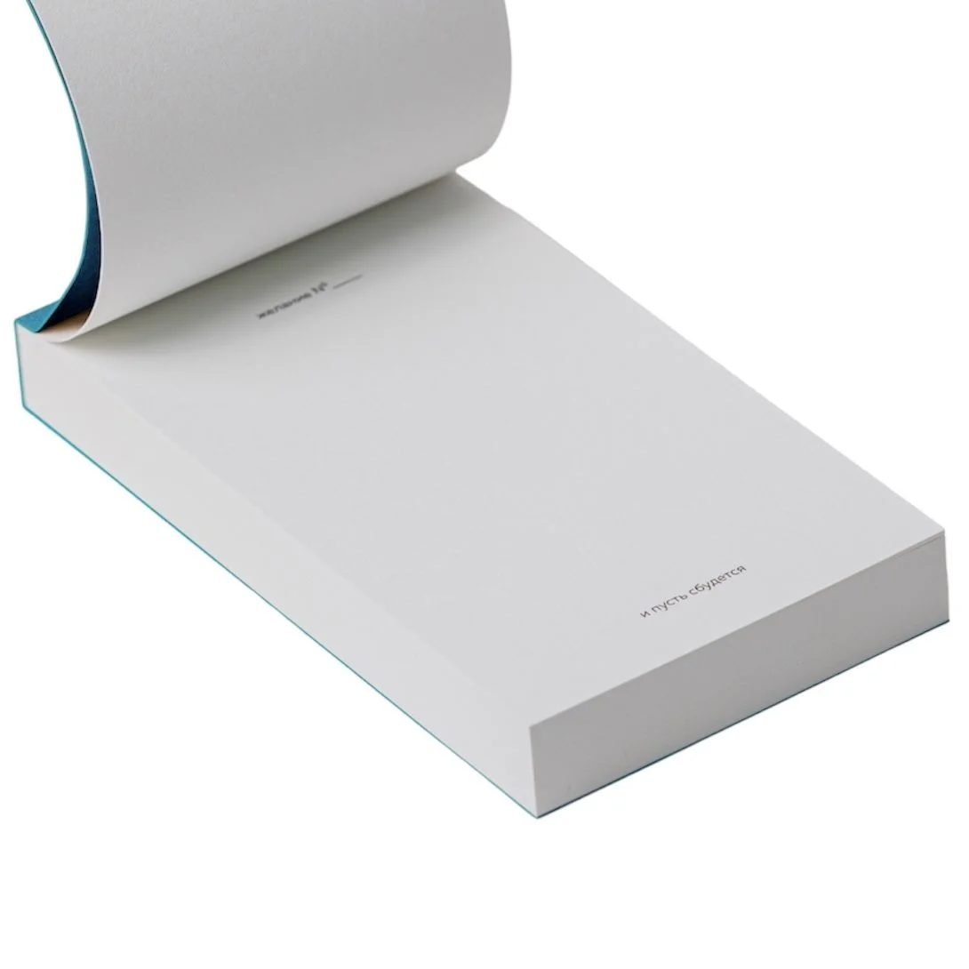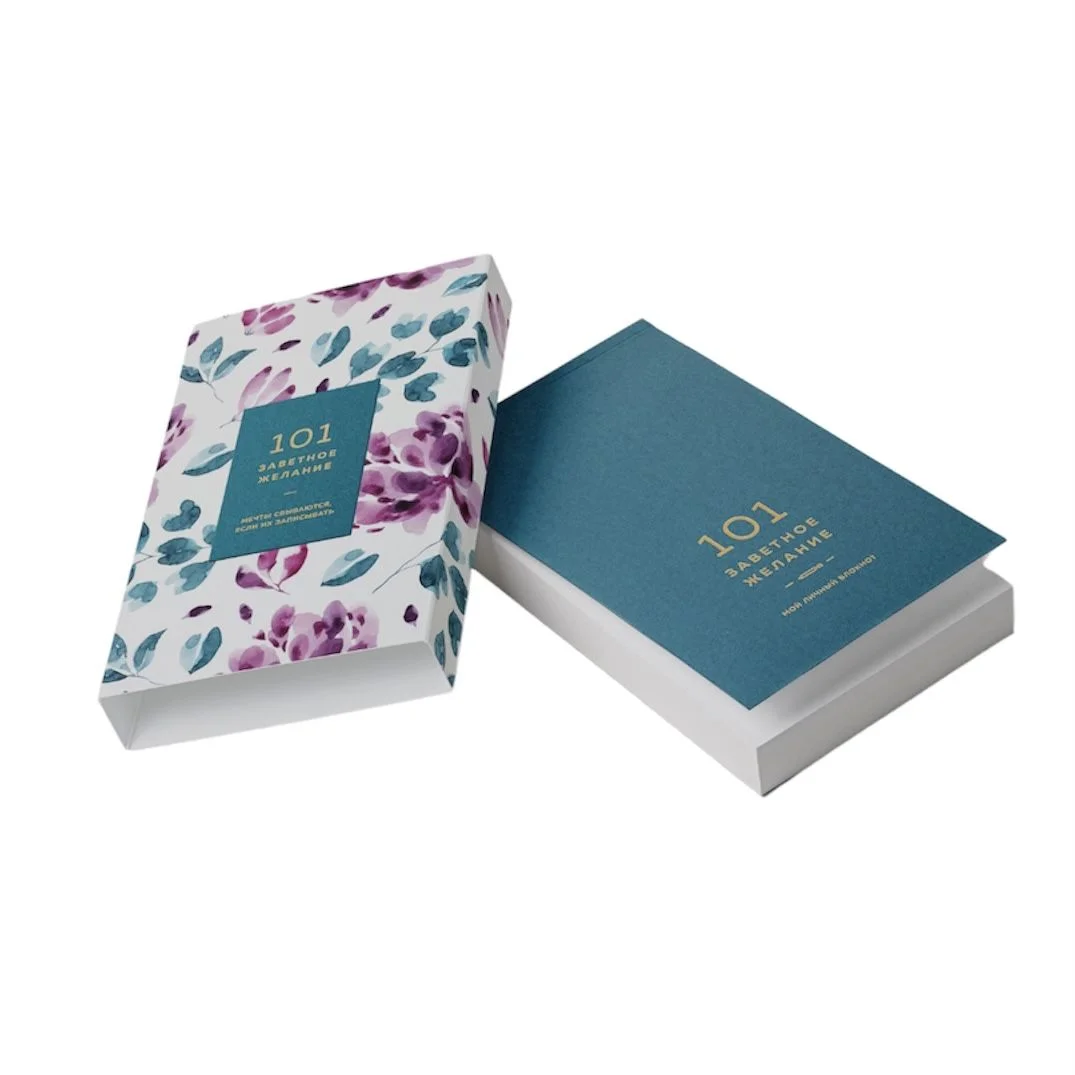Блокнот «101 заветное желание» №5 - карманный блокнот в подарочной упаковке, созданный специально для записи ваших желаний. Он имеет однотонную обложку с яркой красочной папкой-пеналом из картона. Внутри блокнота находится 101 страница - по одной на каждое ваше желание. Листы нелинованные, что позволяет вам свободно выразить свои мысли и идеи.  Обратите внимание, что блокнот небольшого размера, он легко помещается в ладони. Бумага, используемая в блокноте, натуральная и непрозрачная, с немного шершавой текстурой, что придает ей особый шарм. Она также является одной из самых экологичных бумаг в мире.  Обложка блокнота выполнена из цветной дизайнерской бумаги премиального качества, которая приятна на ощупь. Обертка-пенал из запечатанного картона с soft-touch поверхностью защищает блокнот от повреждений и придает ему элегантный вид. Блокнот произведен в России.