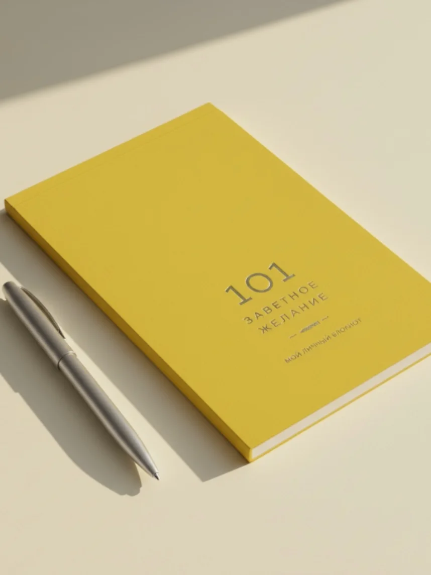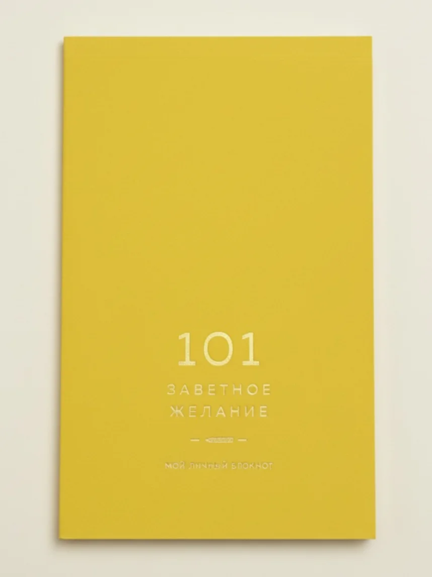 Блокнот «101 заветное желание», желтый - карманный блокнот в подарочной упаковке, созданный специально для записи ваших желаний. Он имеет однотонную обложку с яркой красочной папкой-пеналом из картона. Внутри блокнота находится 101 страница - по одной на каждое ваше желание. Листы нелинованные, что позволяет вам свободно выразить свои мысли и идеи.  Обратите внимание, что блокнот небольшого размера, он легко помещается в ладони. Бумага, используемая в блокноте, натуральная и непрозрачная, с немного шершавой текстурой, что придает ей особый шарм. Она также является одной из самых экологичных бумаг в мире.  Обложка блокнота выполнена из цветной дизайнерской бумаги премиального качества, которая приятна на ощупь. Обертка-пенал из запечатанного картона с soft-touch поверхностью защищает блокнот от повреждений и придает ему элегантный вид. Блокнот произведен в России.