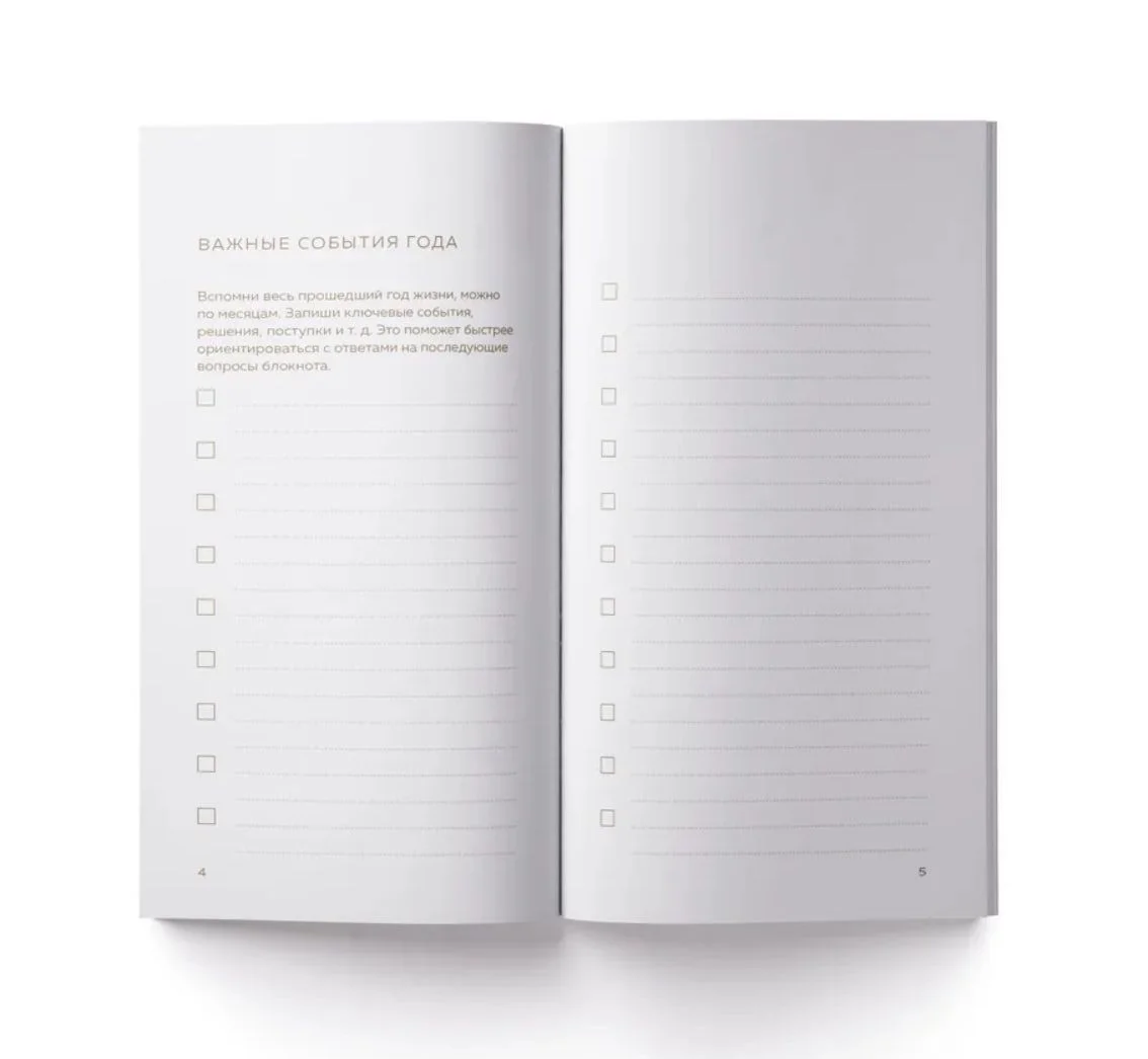 Блокнот традиционно покупают себе в конце уходящего года или в качестве новогоднего подарка. Хотя ограничений по заполнению нет. Итоги года можно подводить в любой момент, когда есть внутренний порыв, а не только накануне Нового года.