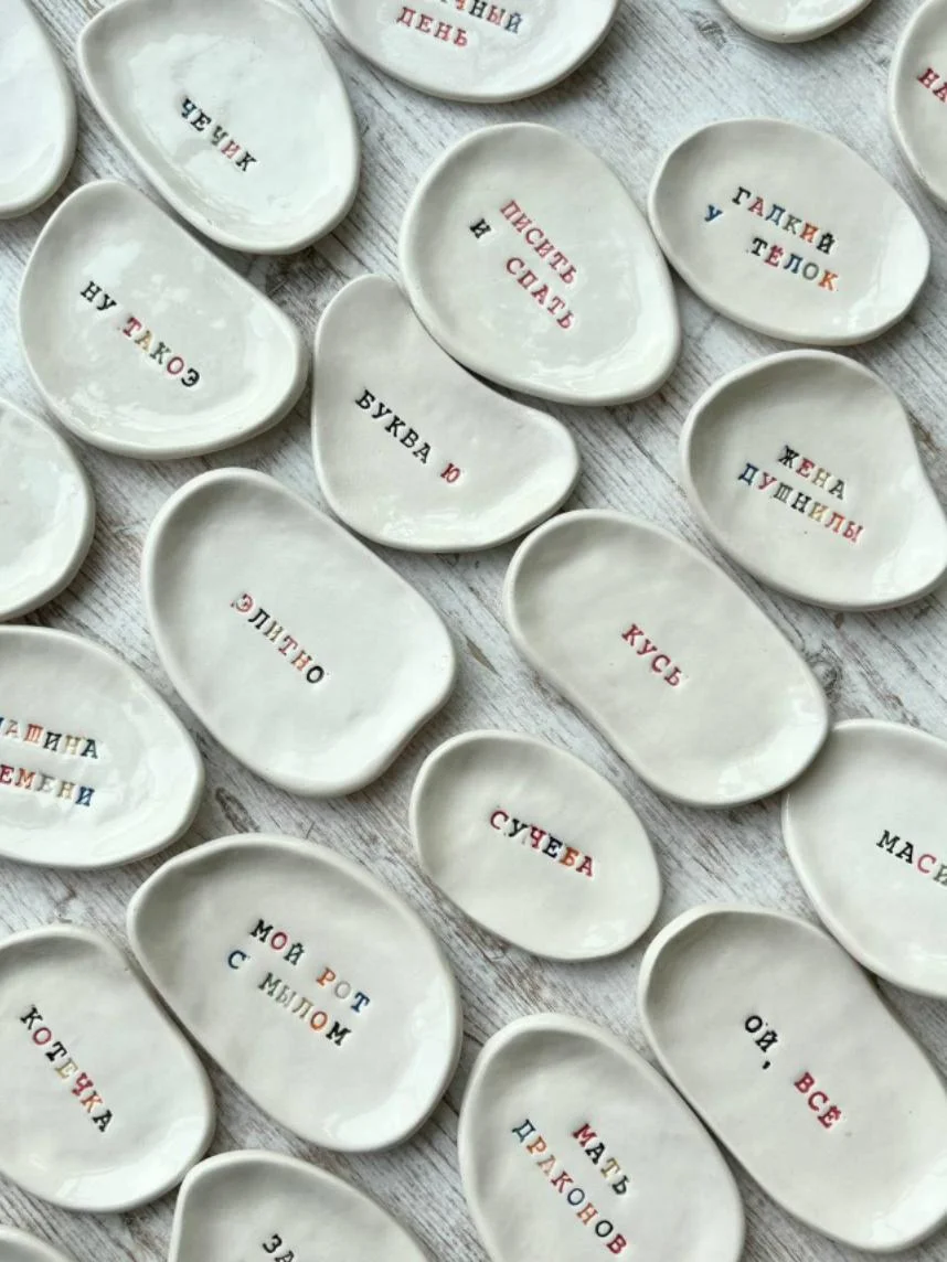 Керамическое блюдце ручной работы с надписью «Недообнимание». Производитель - петербургская керамистка Аня Мурмыло (Keramurrr).
