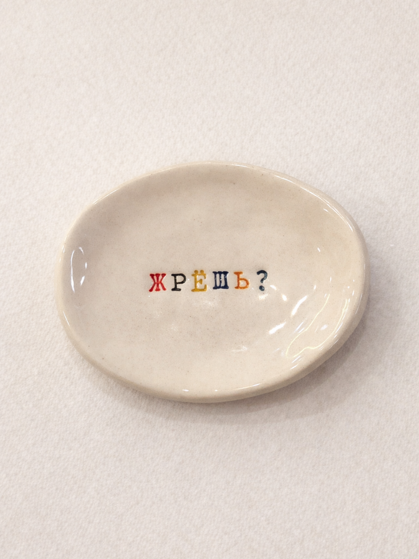 Керамическое блюдце ручной работы с надписью «Жрешь?». Производитель - петербургская керамистка Аня Мурмыло (Keramurrr).