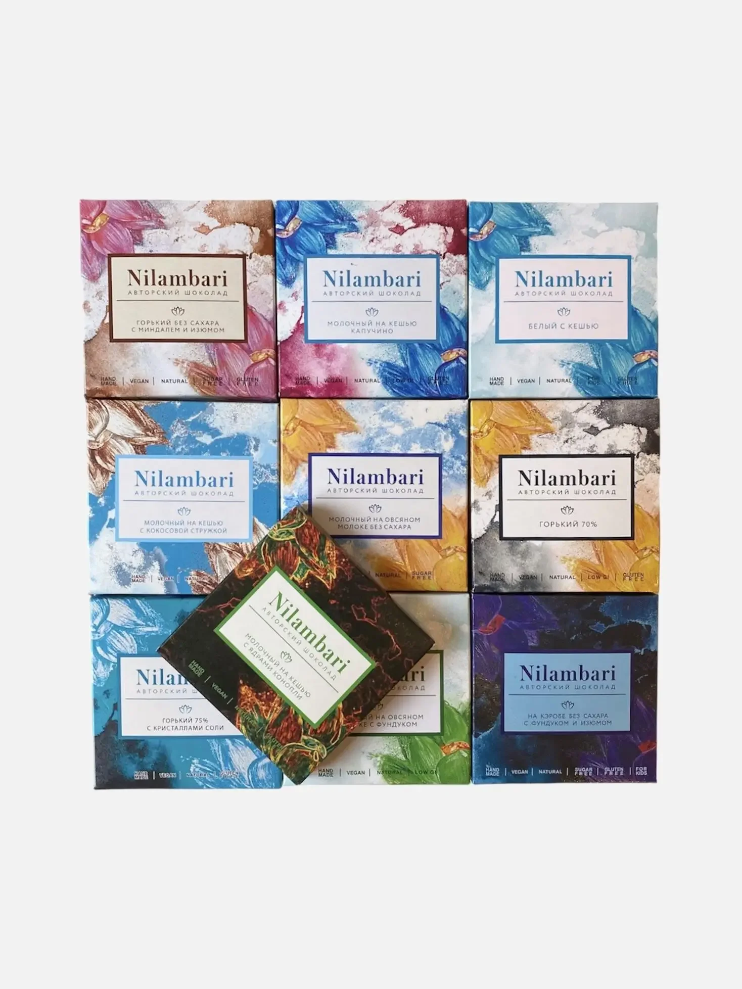 В набор входят 10 плиток авторского шоколада Nilambari, которые удивят любого разнообразием вкусов, и оригинальная открытка.