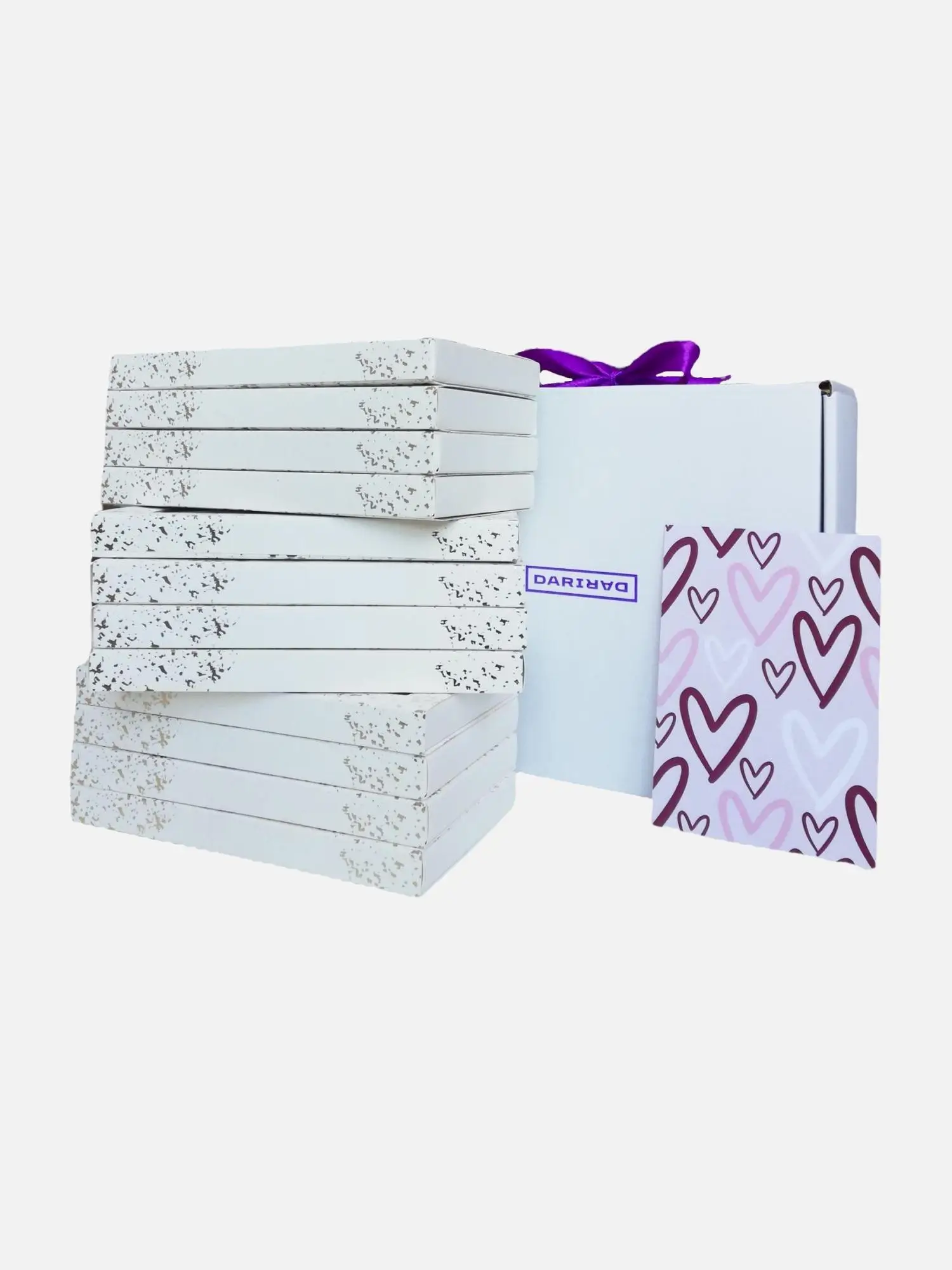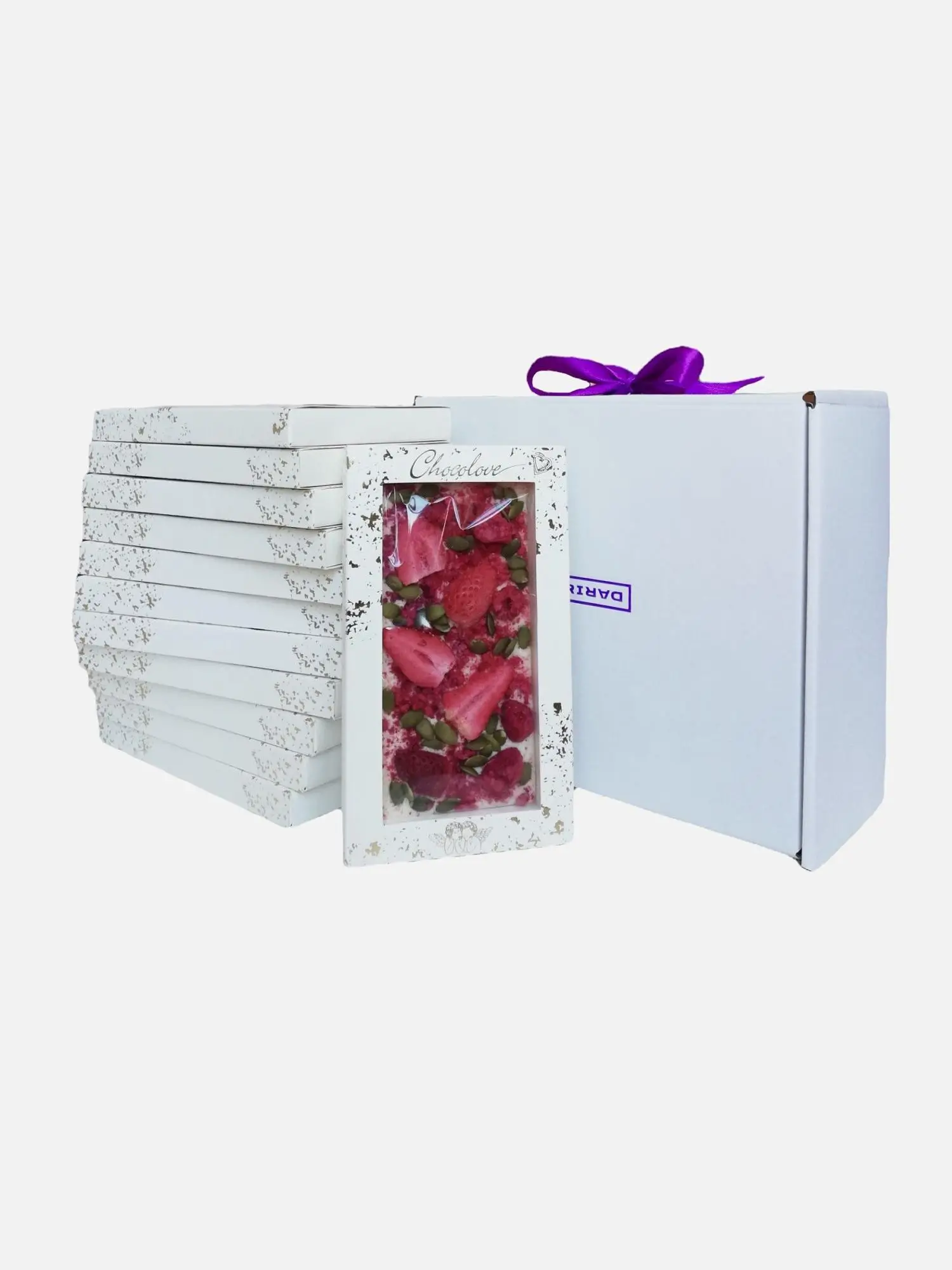 В набор входят 12 плиток шоколада ручной работы, которые удивят любого разнообразием вкусов, и оригинальная открытка.