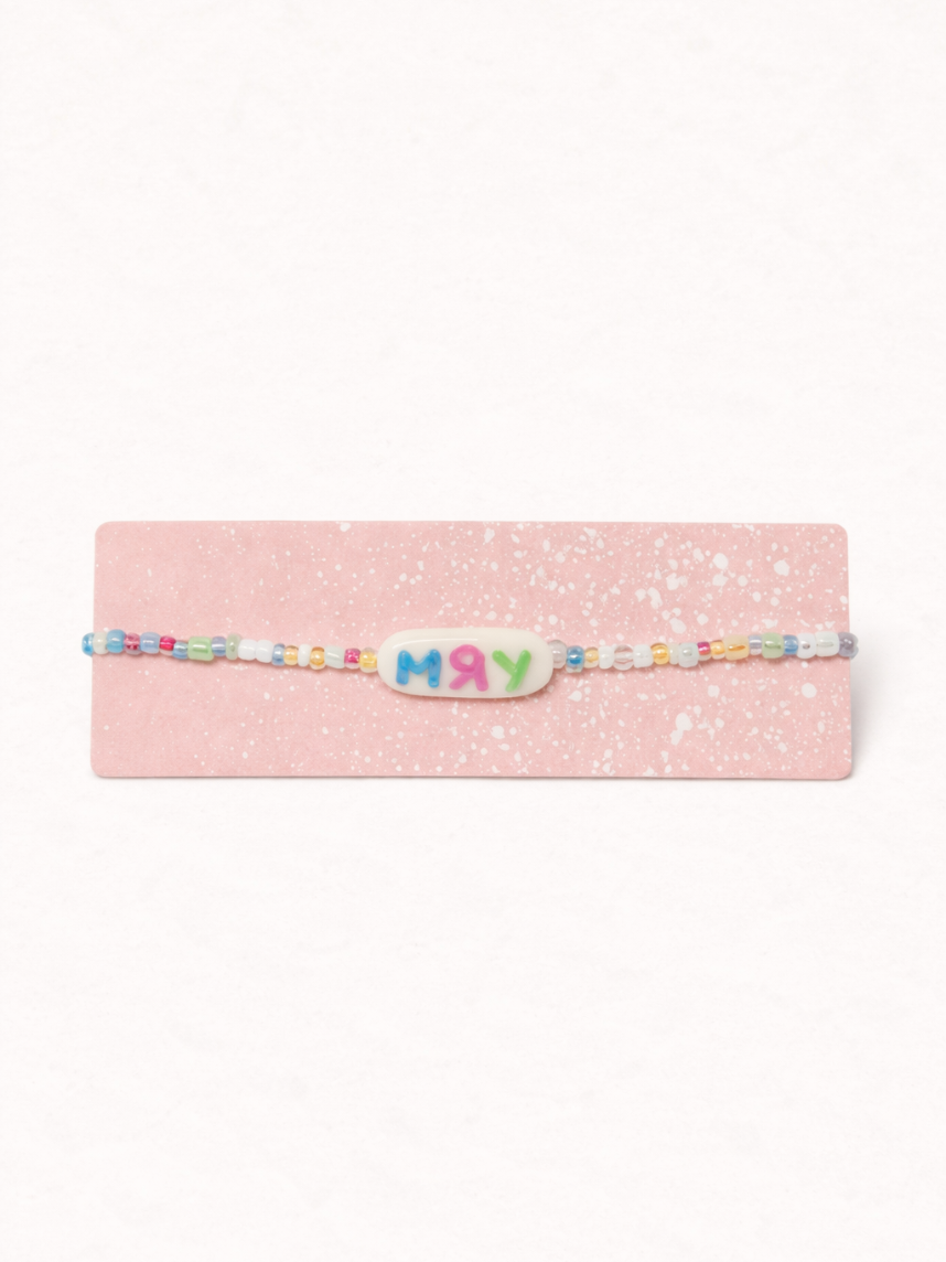 Браслет на резинке, длина примерно 17 см в обхвате. Надпись выполнена маркером на бусине из полимерной глины и покрыта лаком.