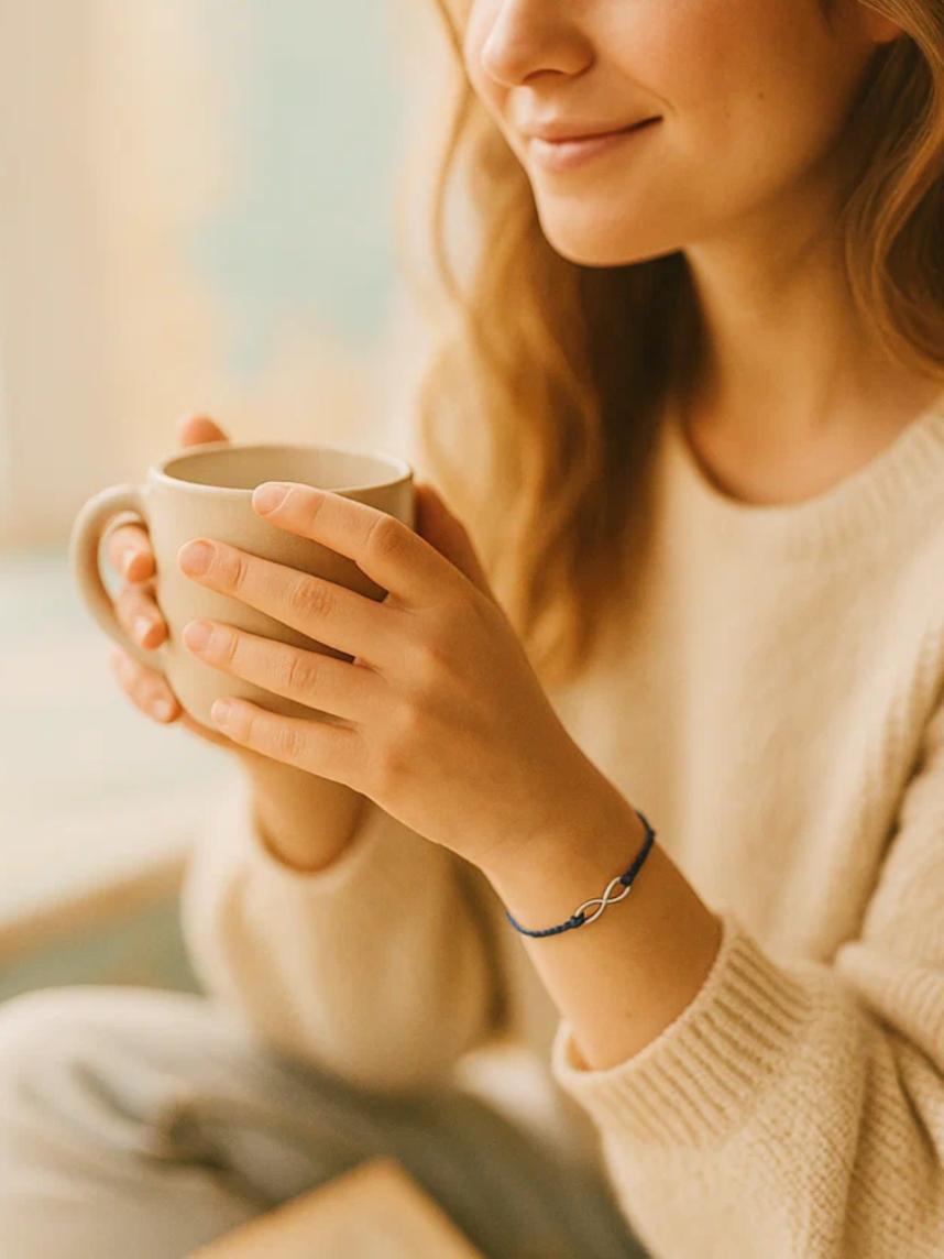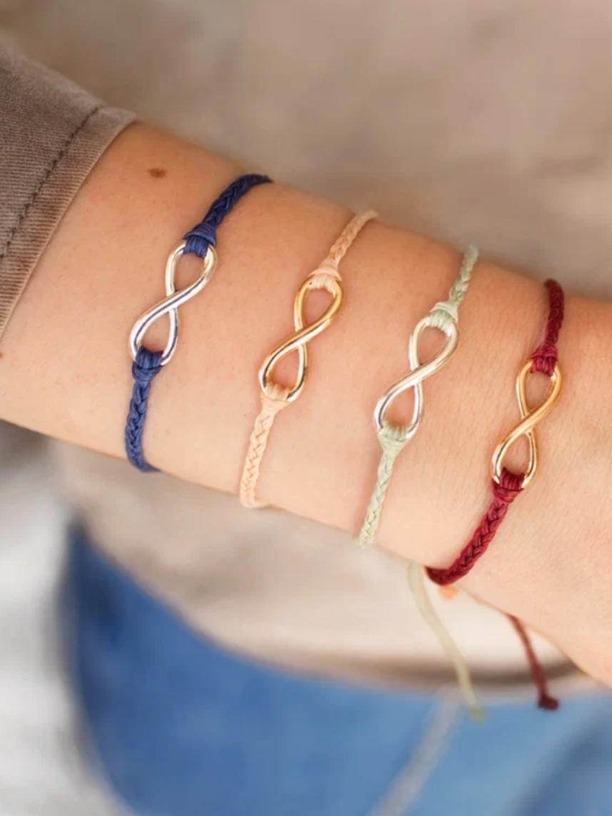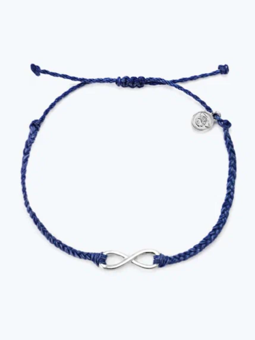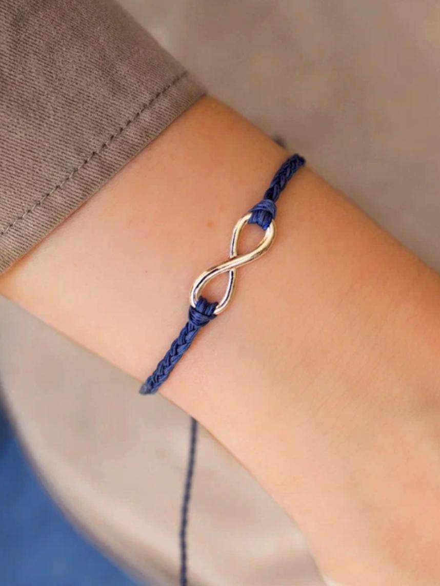 Этот браслет сделан из темно-синей нити, которая дополнена красивым серебристым шармом с изображением бесконечности.