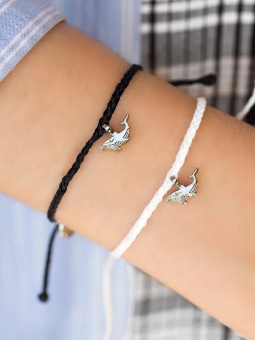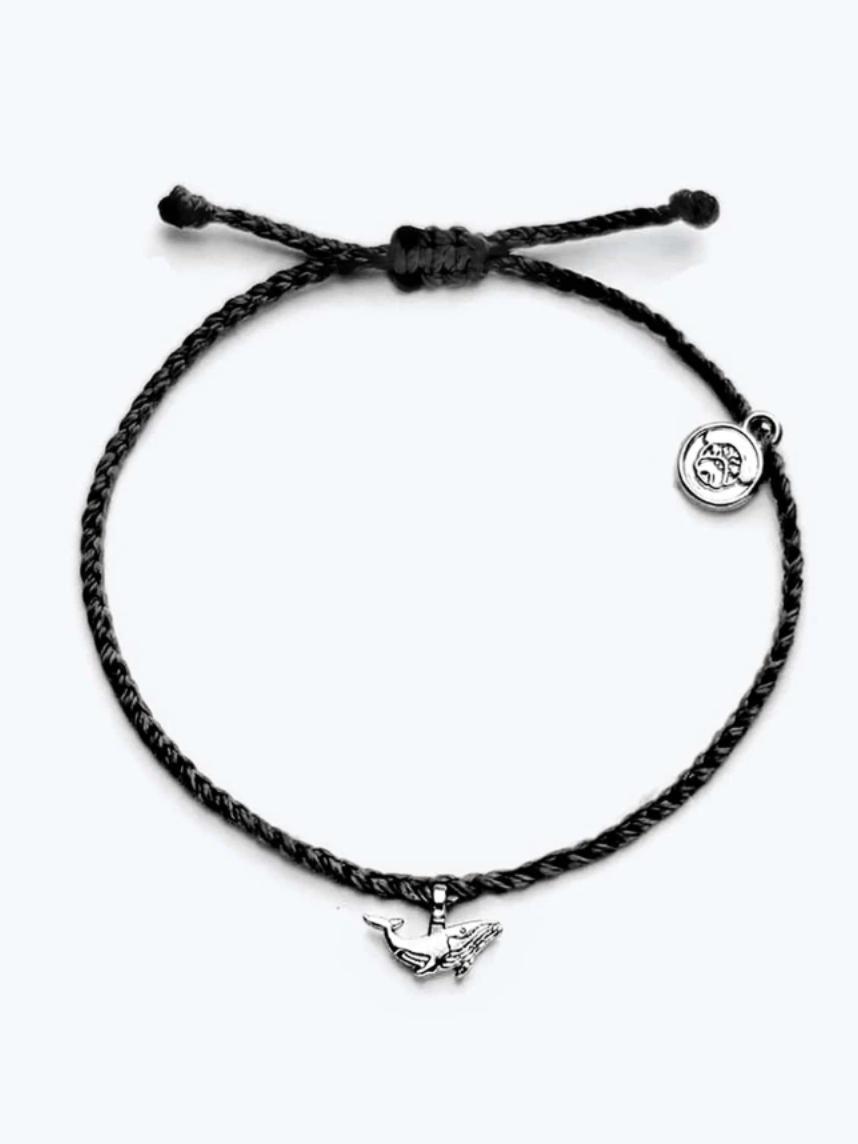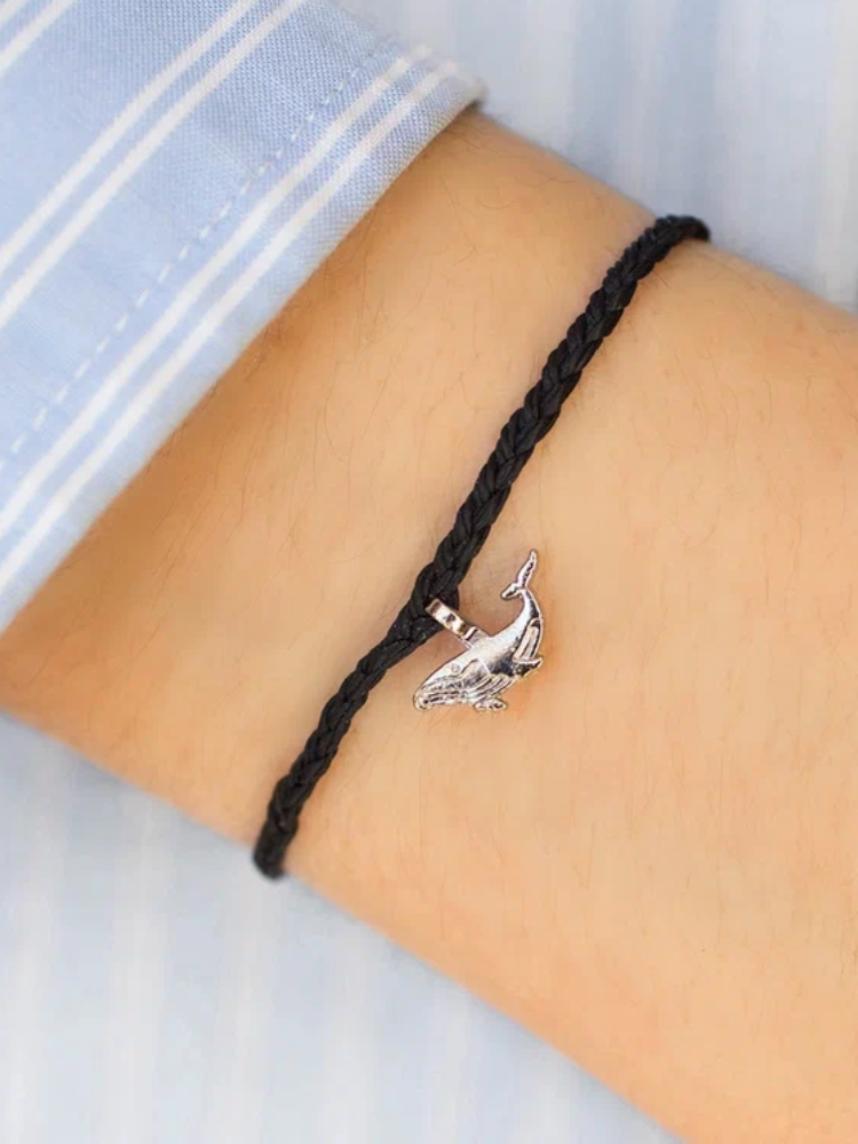 Браслет с черной нитью и серебристым шармом в форме кита — это стильный аксессуар для любителей морских приключений.