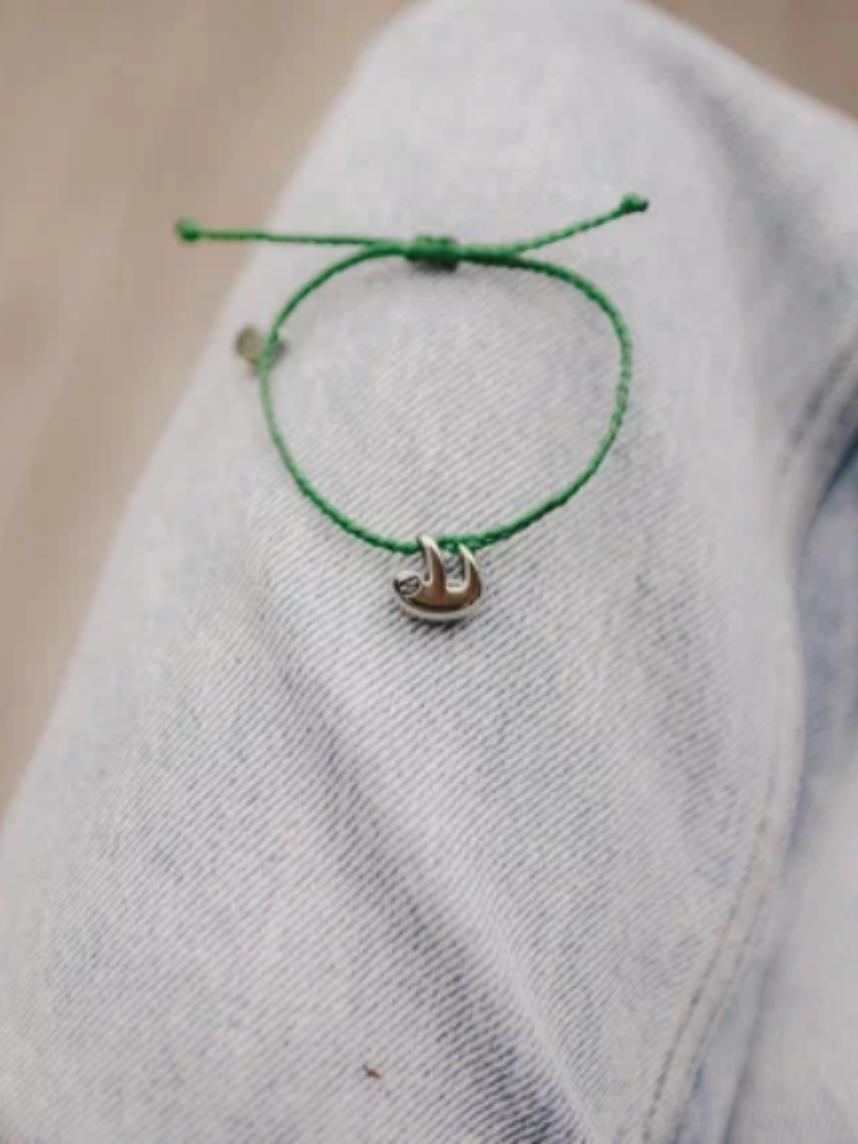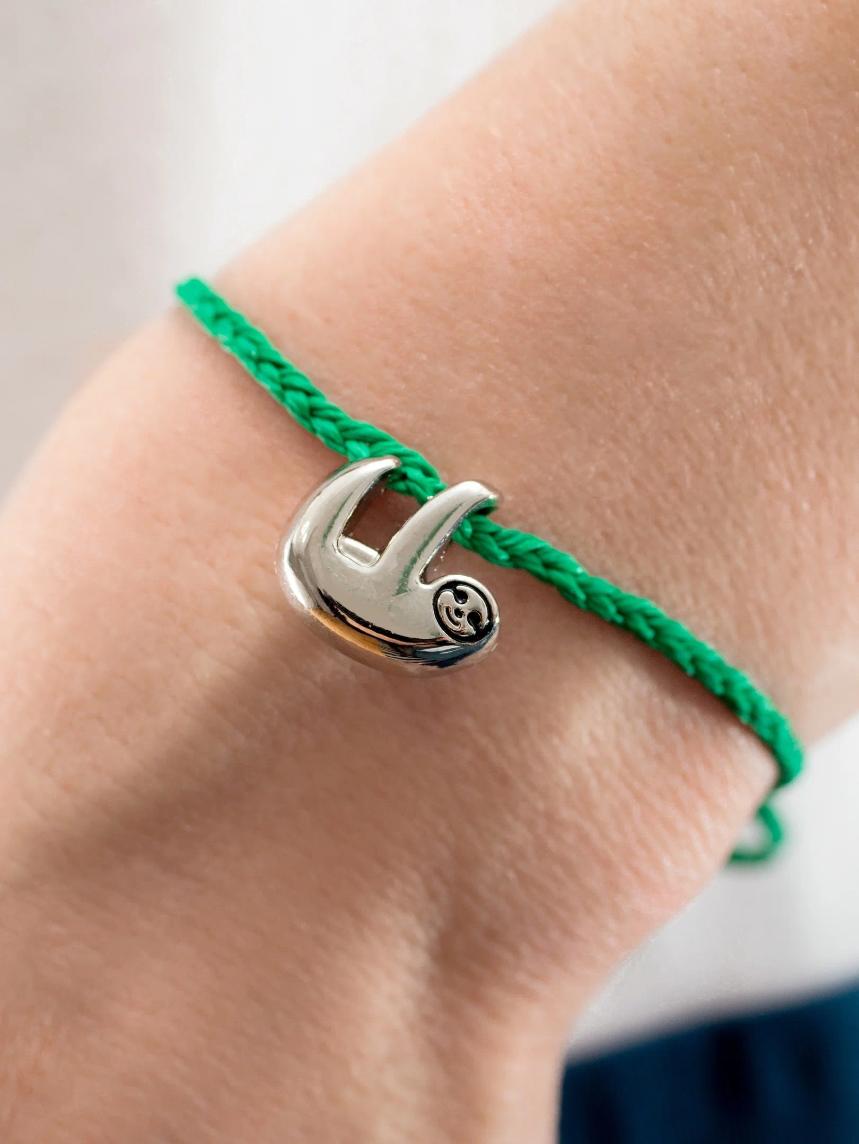 Браслет с зелёной нитью и серебристым шармом в виде ленивца - это отличный выбор для любителей природы и животных.