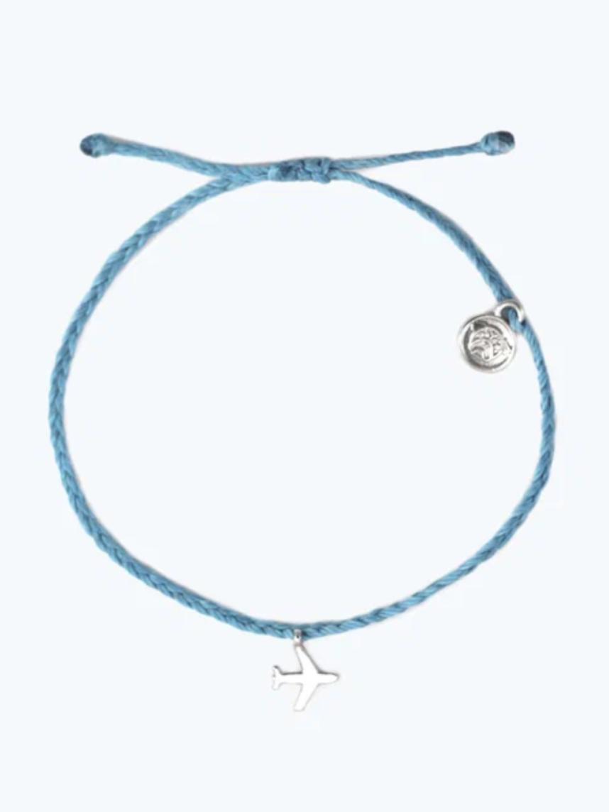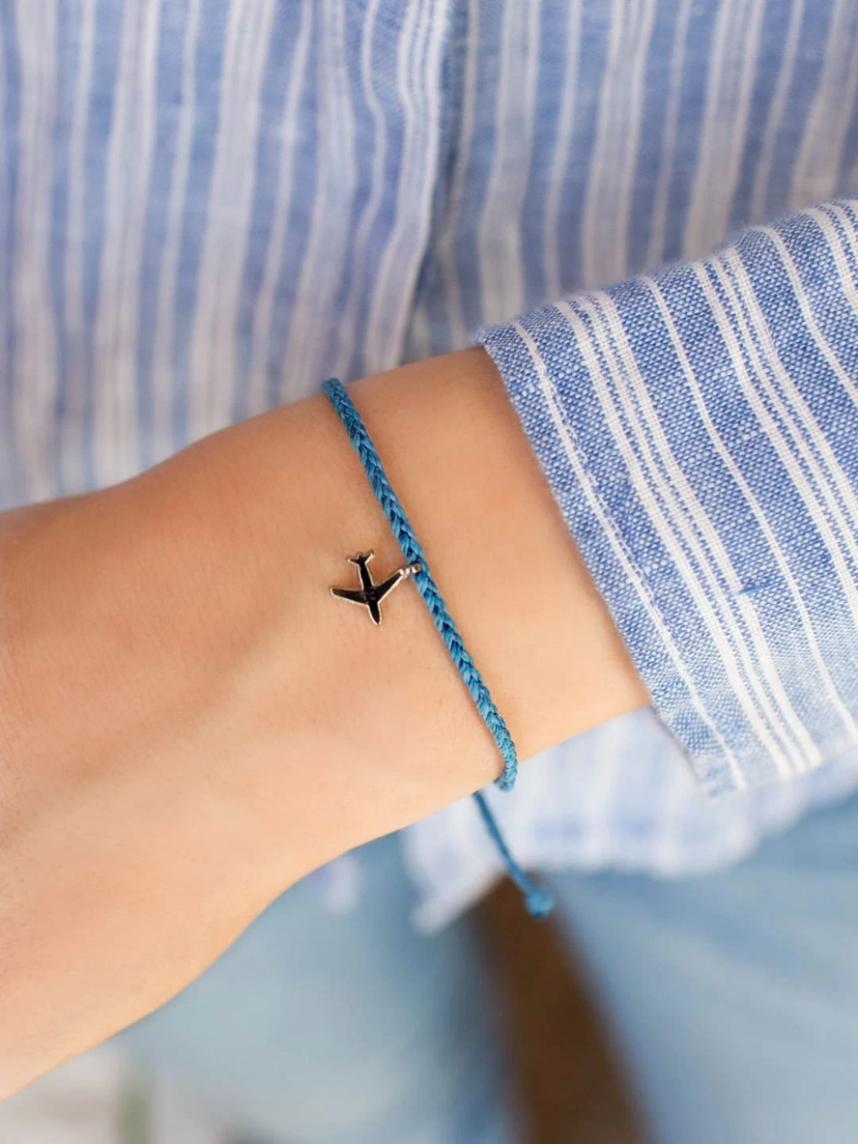 Браслет, выполненный из синей нити и украшенный серебристым шармом с изображением самолета, напоминает о бесконечном просторе неба и возможностях путешествий.