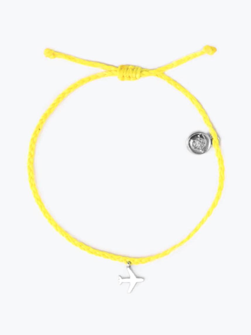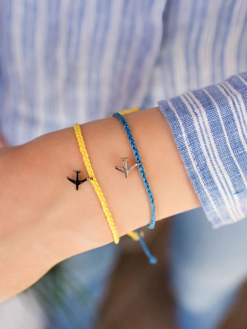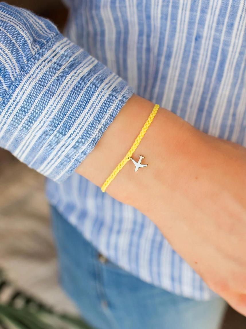 Браслет с желтой нитью и серебристым шармом с самолетом навевает ассоциации с яркими приключениями и путешествиями.