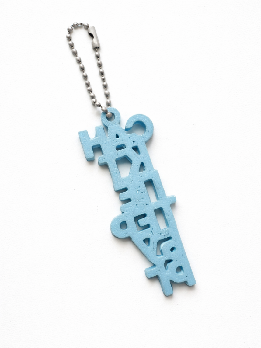Брелок выполнен из пластика методом 3d печати, висит на стальном тросике с удобным винтовым замком.