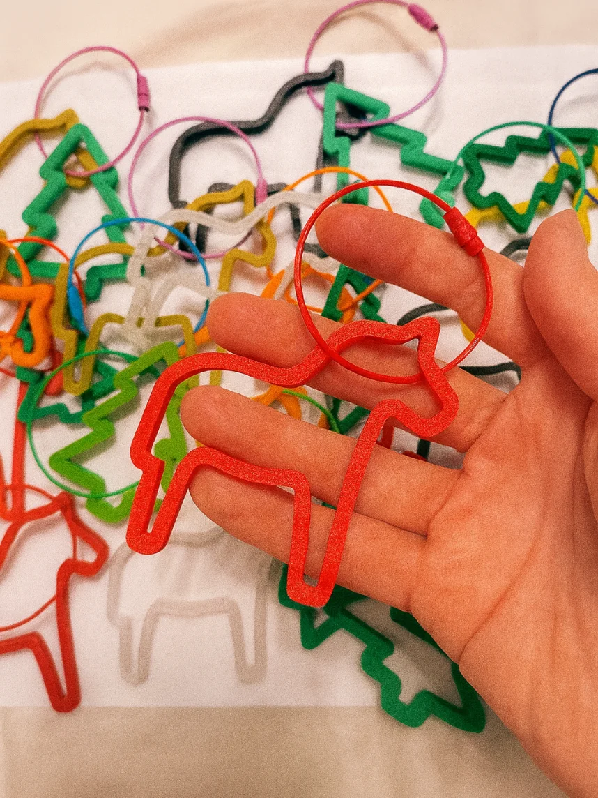 Брелок выполнен из пластика методом 3d печати, висит на стальном тросике с удобным винтовым замком.