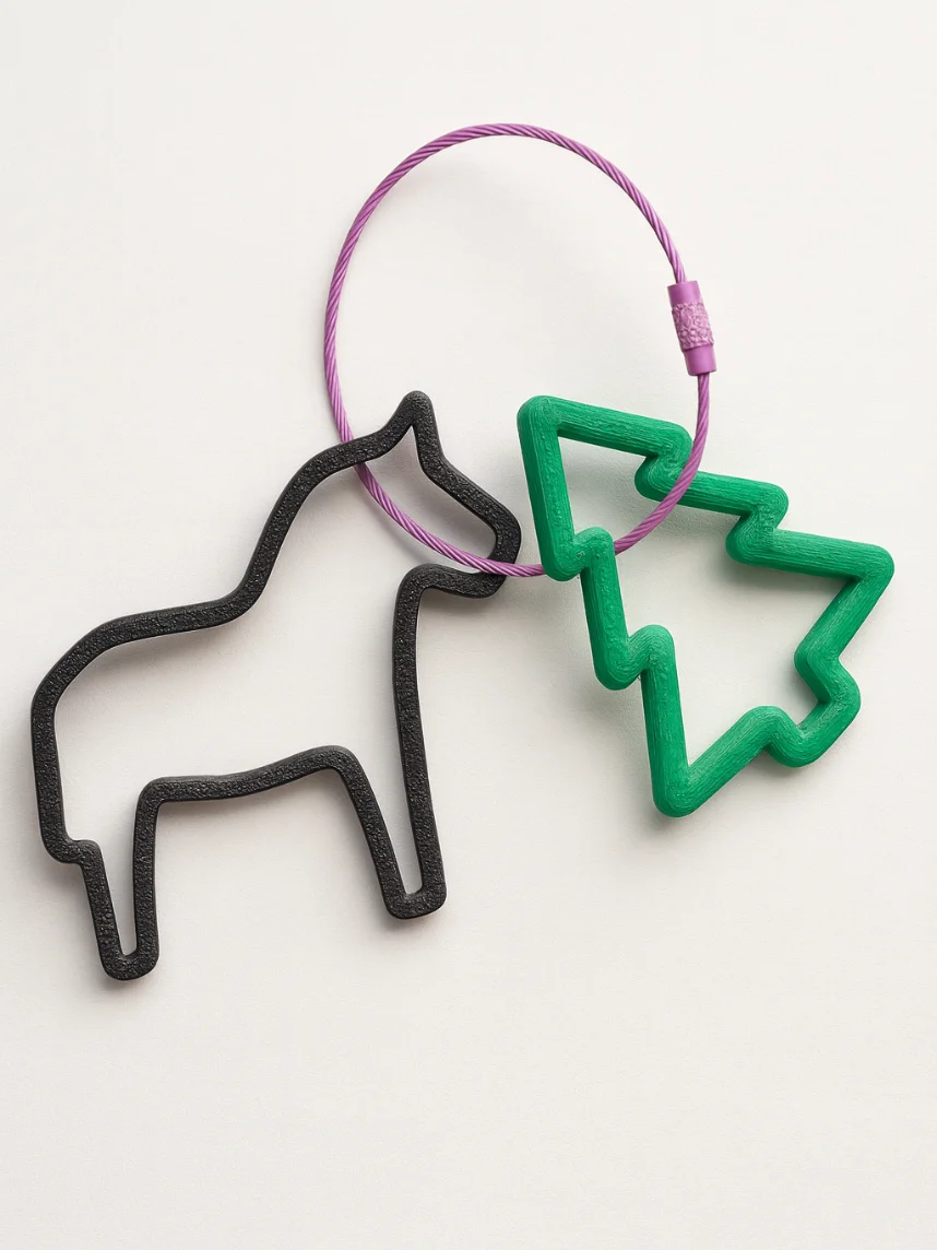 Брелок выполнен из пластика методом 3d печати, висит на стальном тросике с удобным винтовым замком.