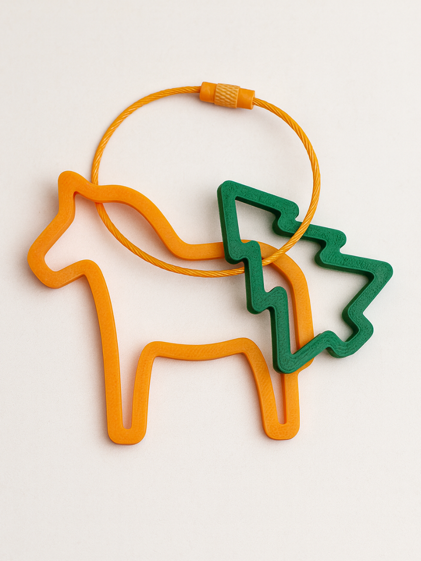Брелок выполнен из пластика методом 3d печати, висит на стальном тросике с удобным винтовым замком.