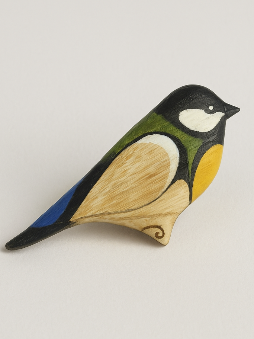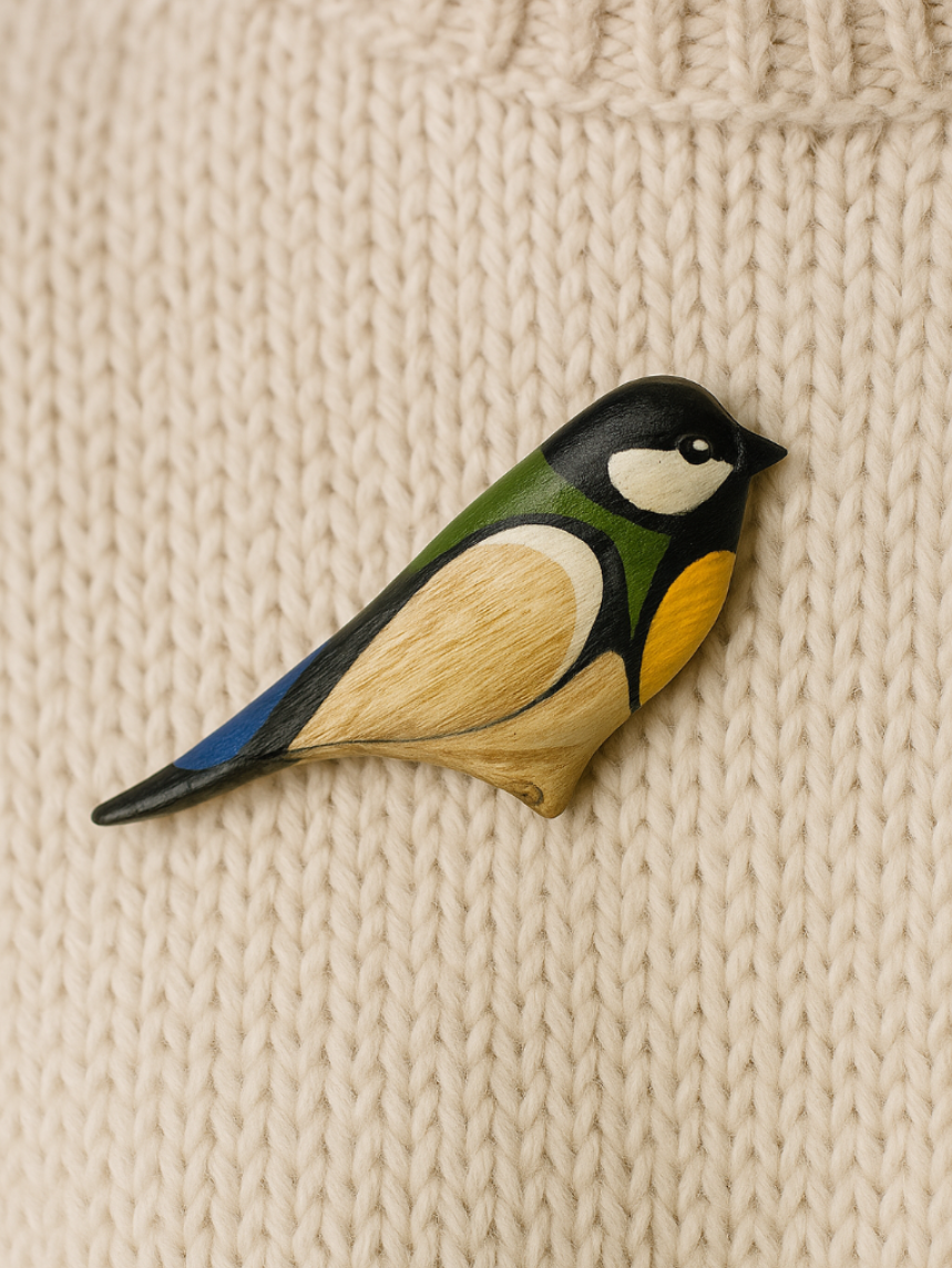 Брошь «Большая синица» от бренда Free in tree - деревянная ручной работы с росписью. Это идеальный аксессуар для любителей живой природы.