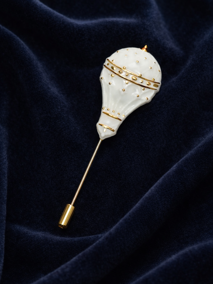 Фарфоровая брошь «Аэростат» в бело-золотистом цвете.
