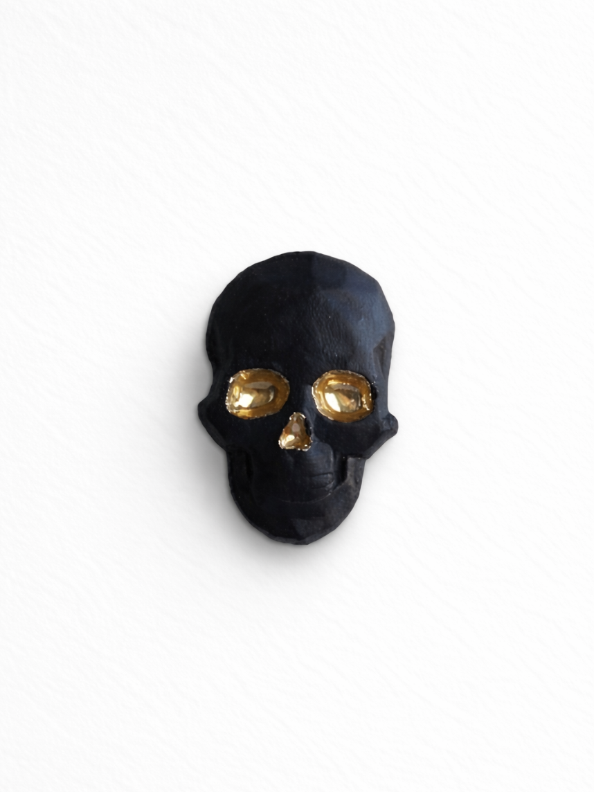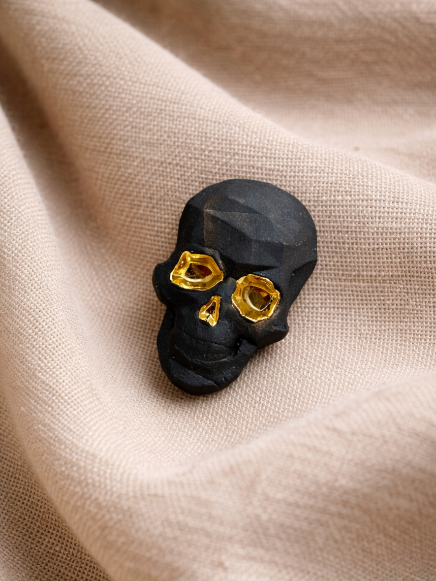Фарфоровая брошь «Череп полигональный» в чёрно-золотом цвете.