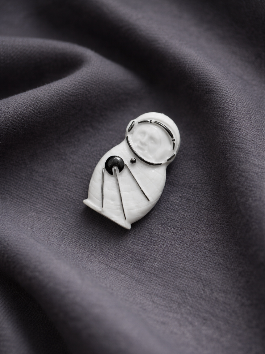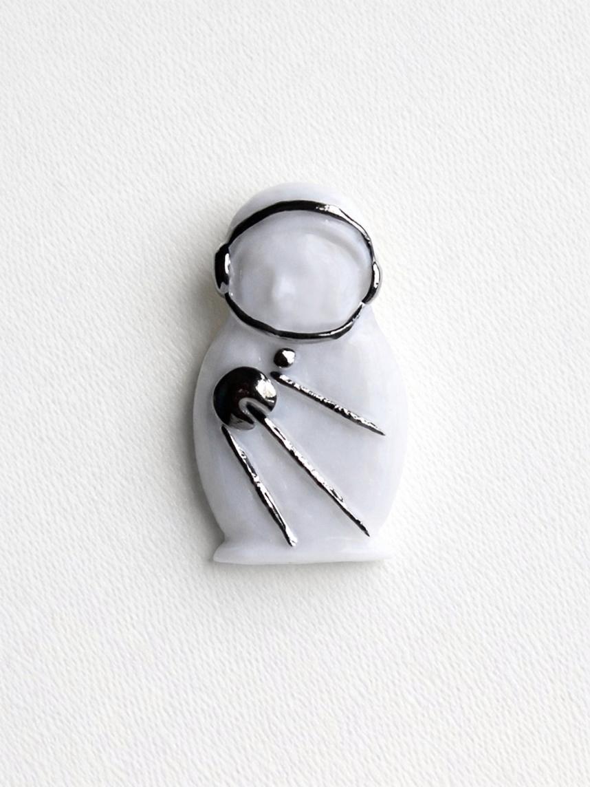 Брошь ручной работы Bulygin «Гагарин» малая, бело-серебристая, фарфор