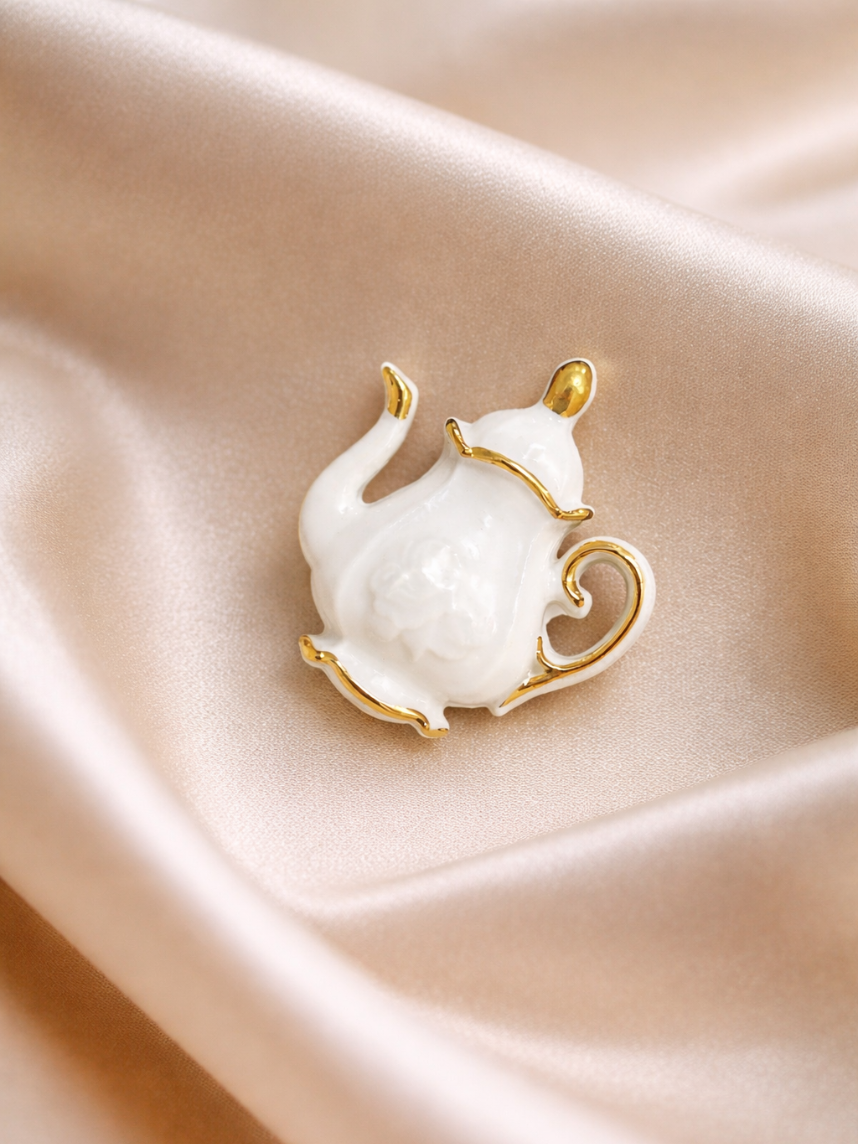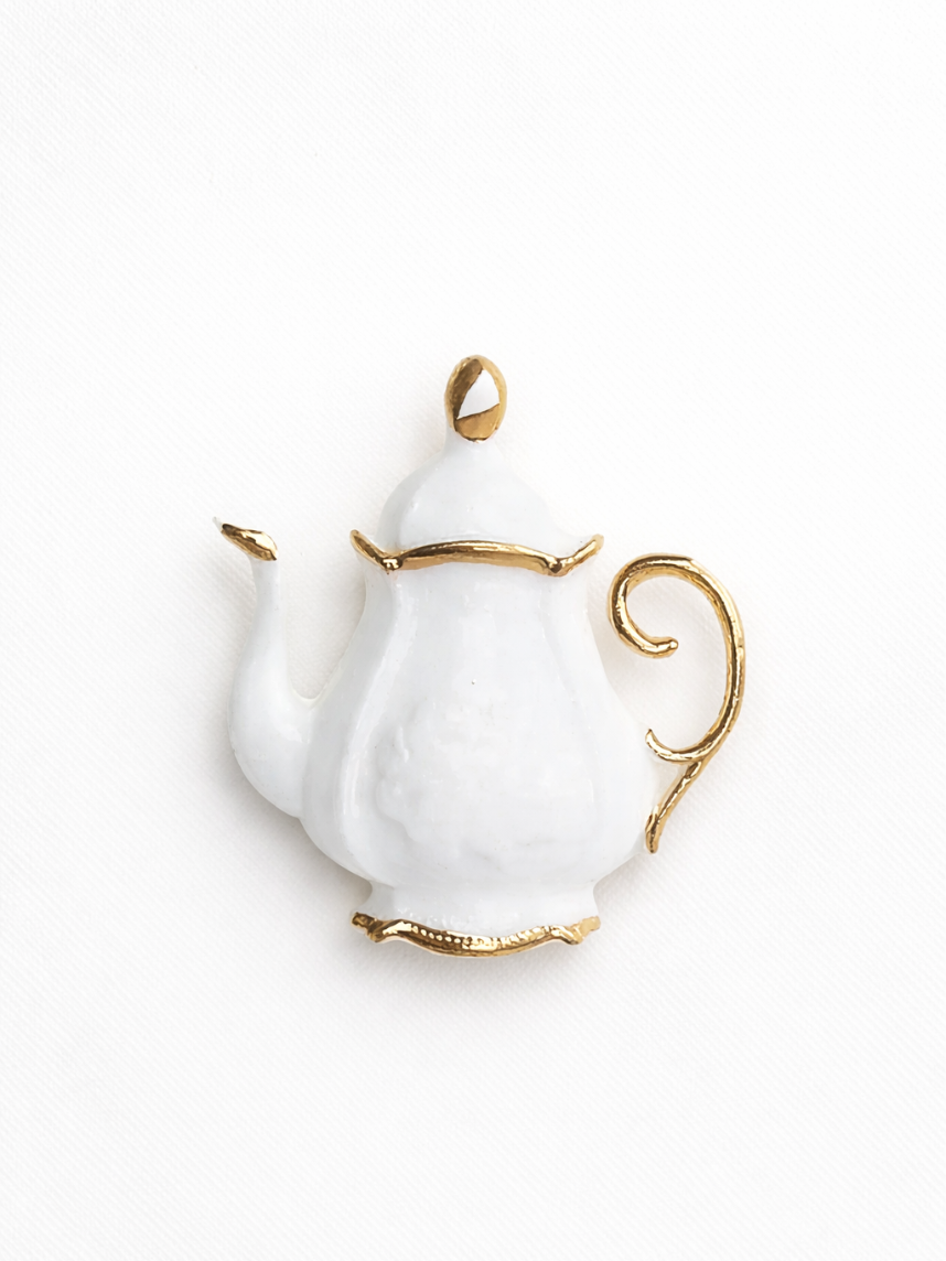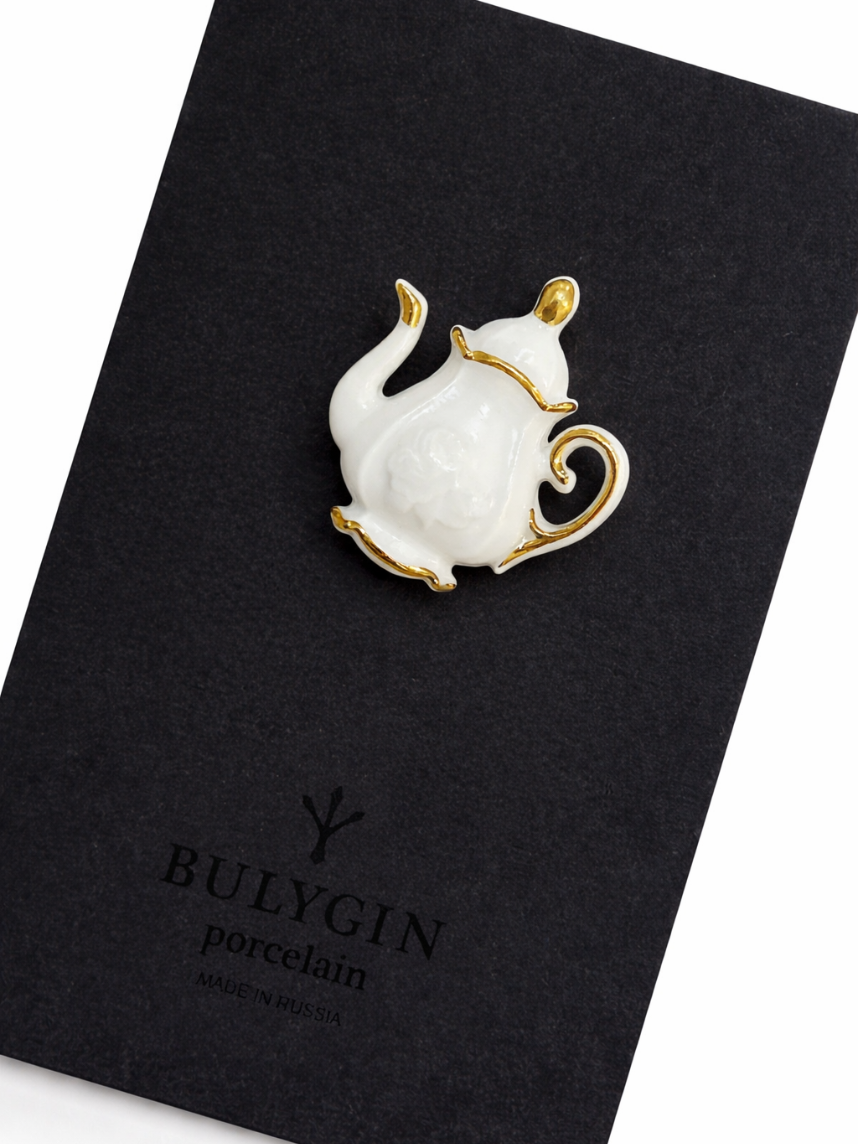 Фарфоровая брошь «Кофейник» в бело-золотистом цвете от бренда BULYGIN porcelain.