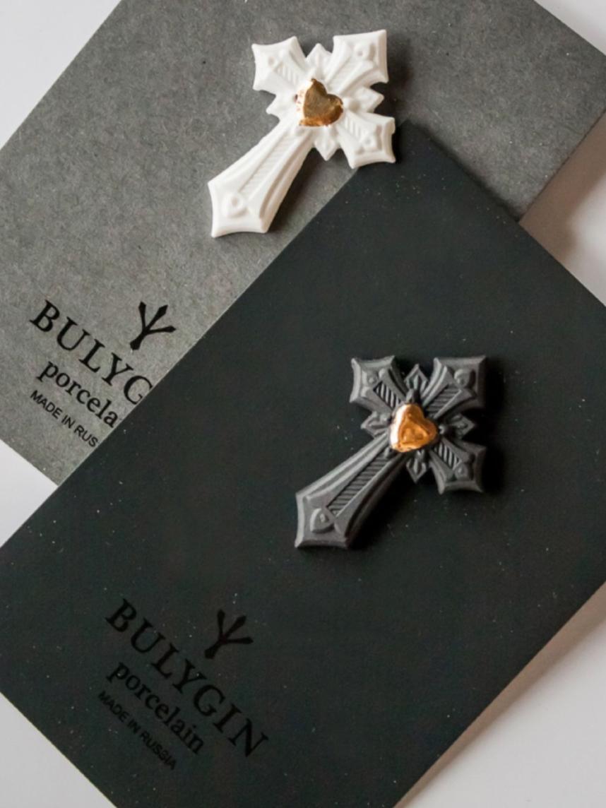 Фарфоровая брошь «Крест» в чёрно-золотом цвете от бренда BULYGIN porcelain.