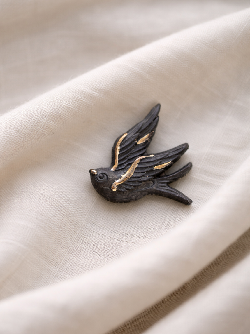 Фарфоровая брошь «Ласточка» чёрно-золотого цвета.