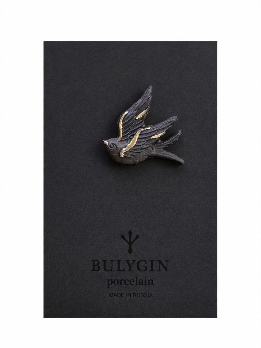 Брошь ручной работы Bulygin «Ласточка», фарфор, чёрно-золотистая