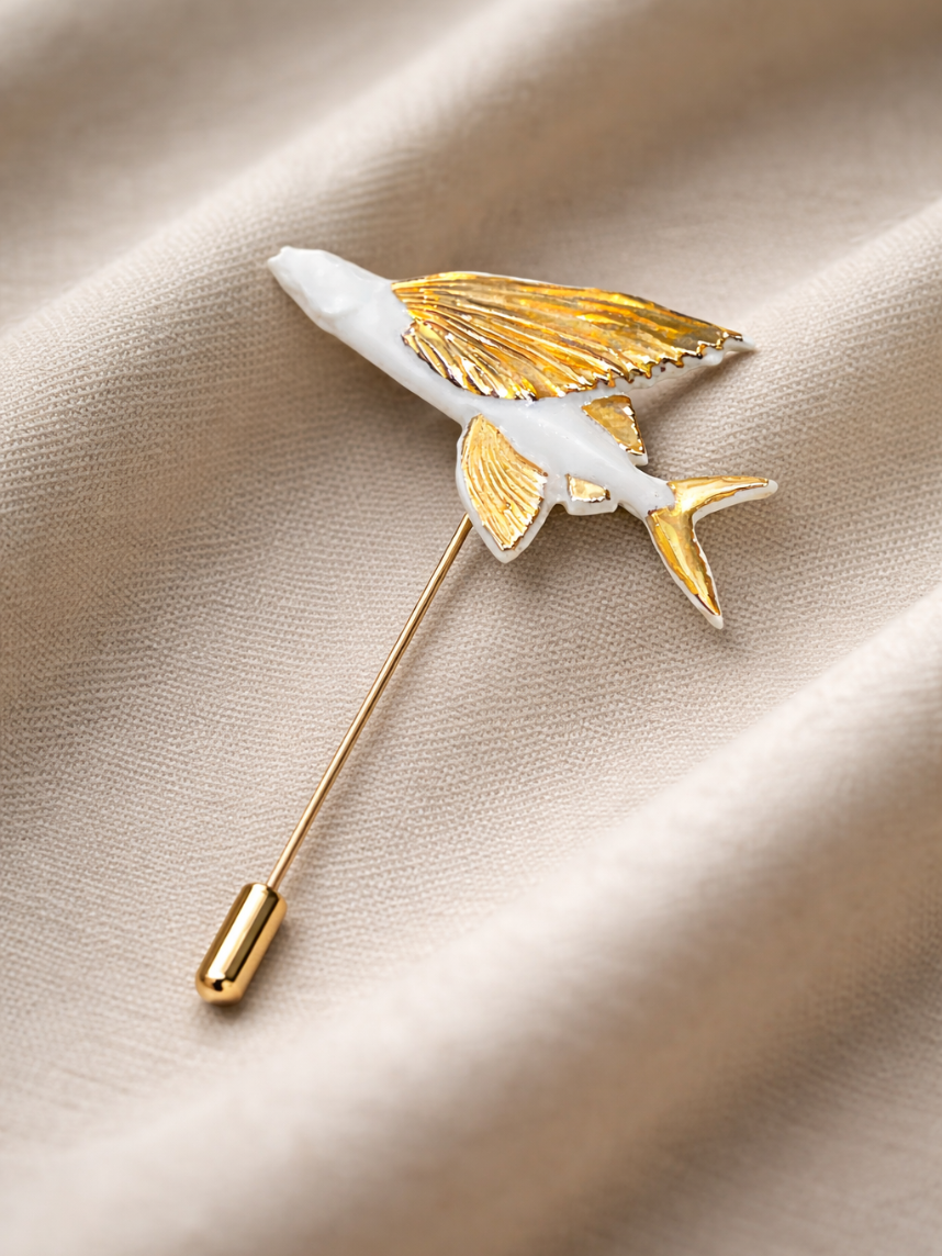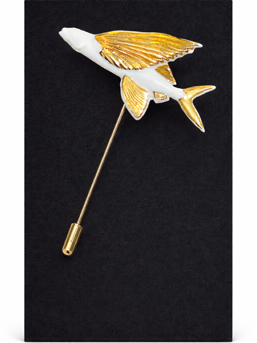 Фарфоровая брошь «Летучая рыба» в бело-золотистом цвете.