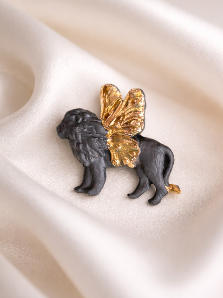 Брошь ручной работы Bulygin «Лев», фарфор, чёрно-золотистая