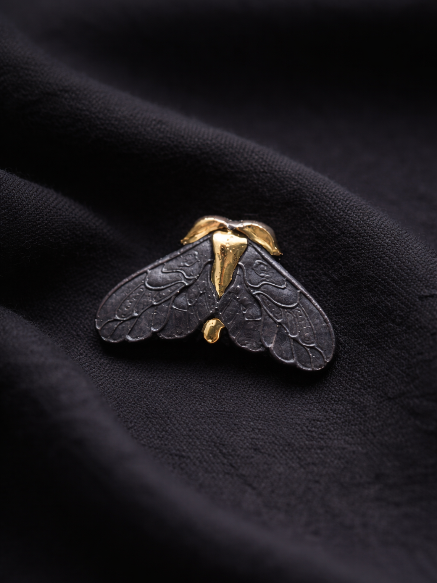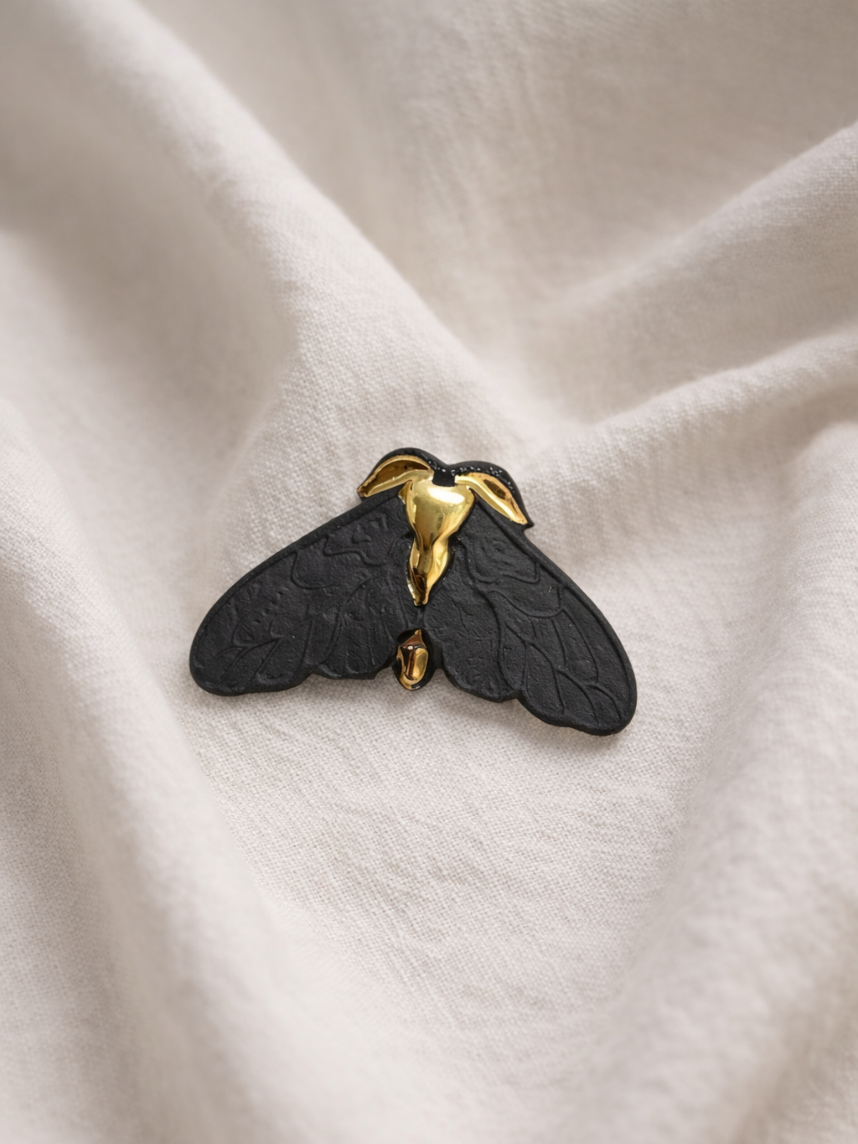 Фарфоровая брошь «Моль» в чёрно-золотом цвете.