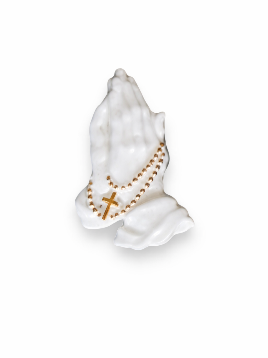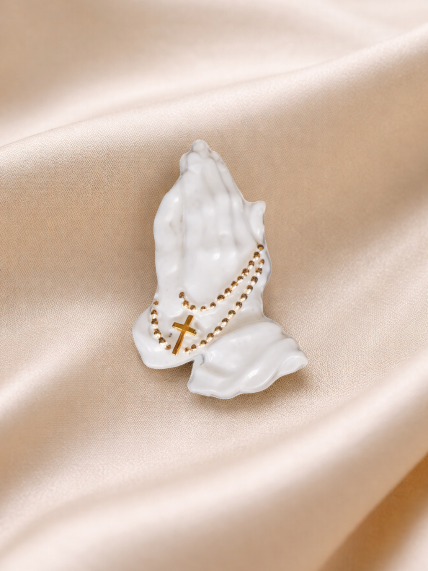 Фарфоровая брошь «Молитва» в бело-золотистом цвете.