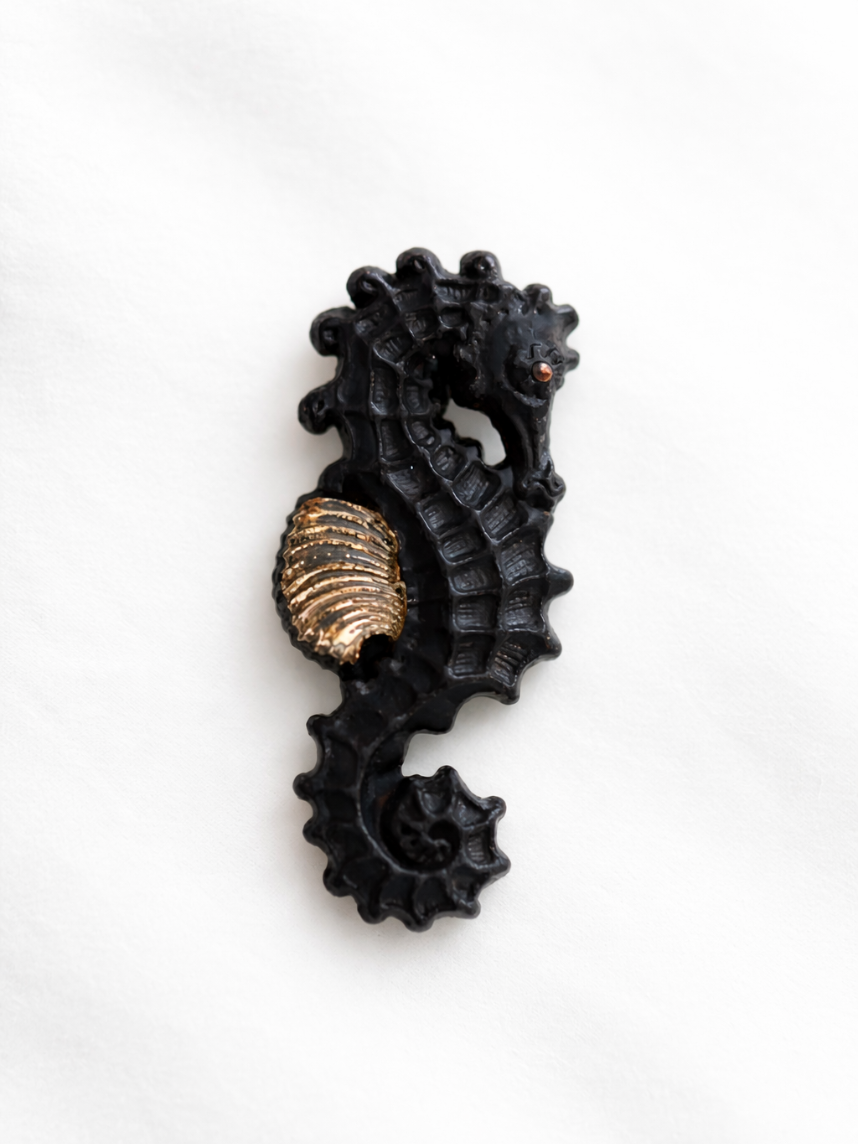 Фарфоровая брошь «Морской конёк» в чёрно-золотом цвете.