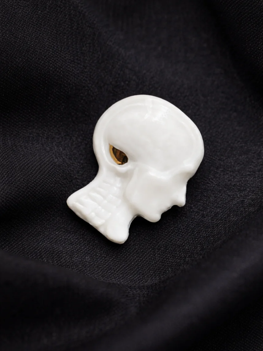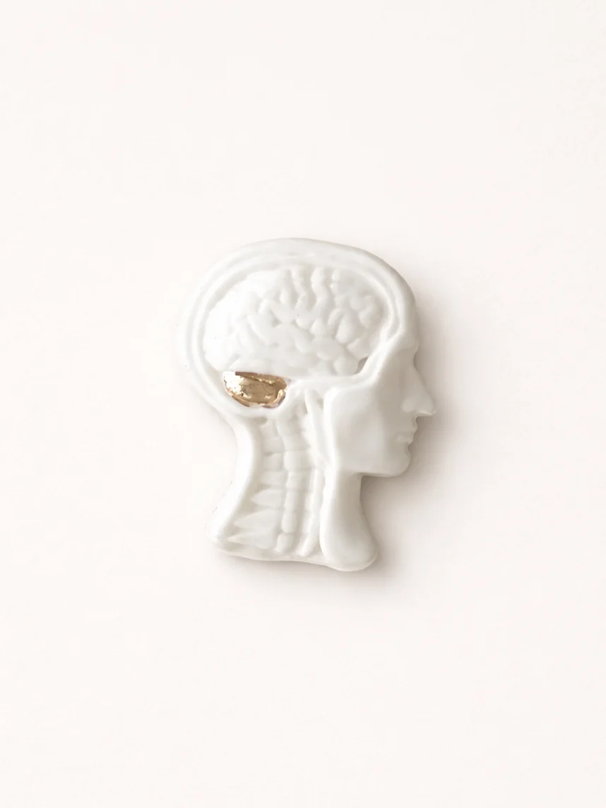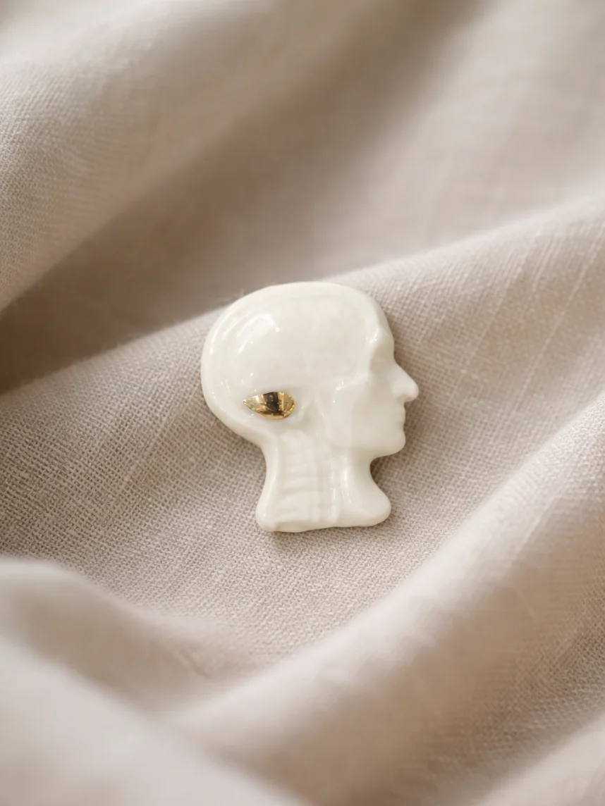 Фарфоровая брошь «Мозг» в бело-золотистом цвете.