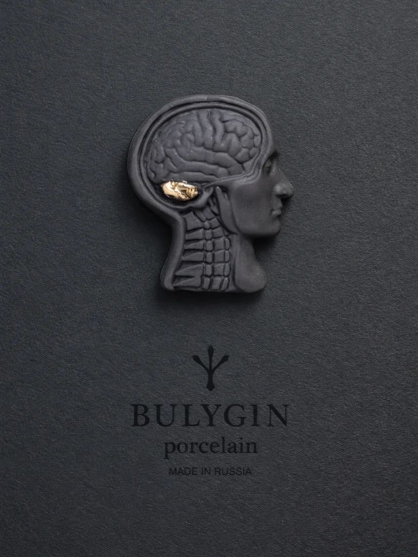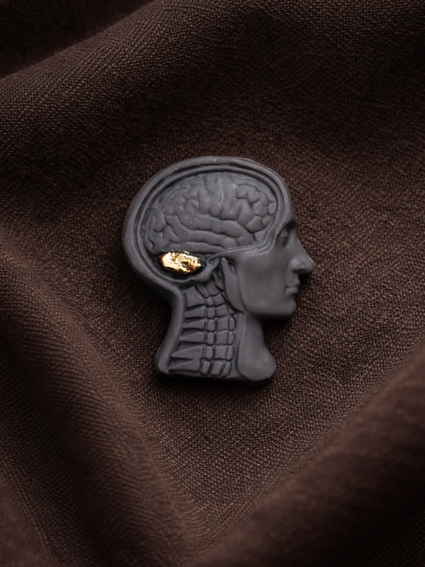 Фарфоровая брошь «Мозг» в чёрно-золотом цвете.