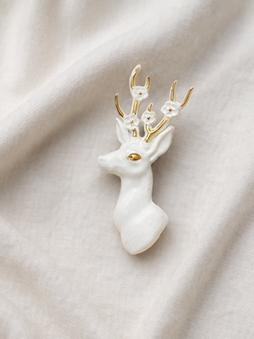 Фарфоровая брошь «Олень» в бело-золотистом цветем.
