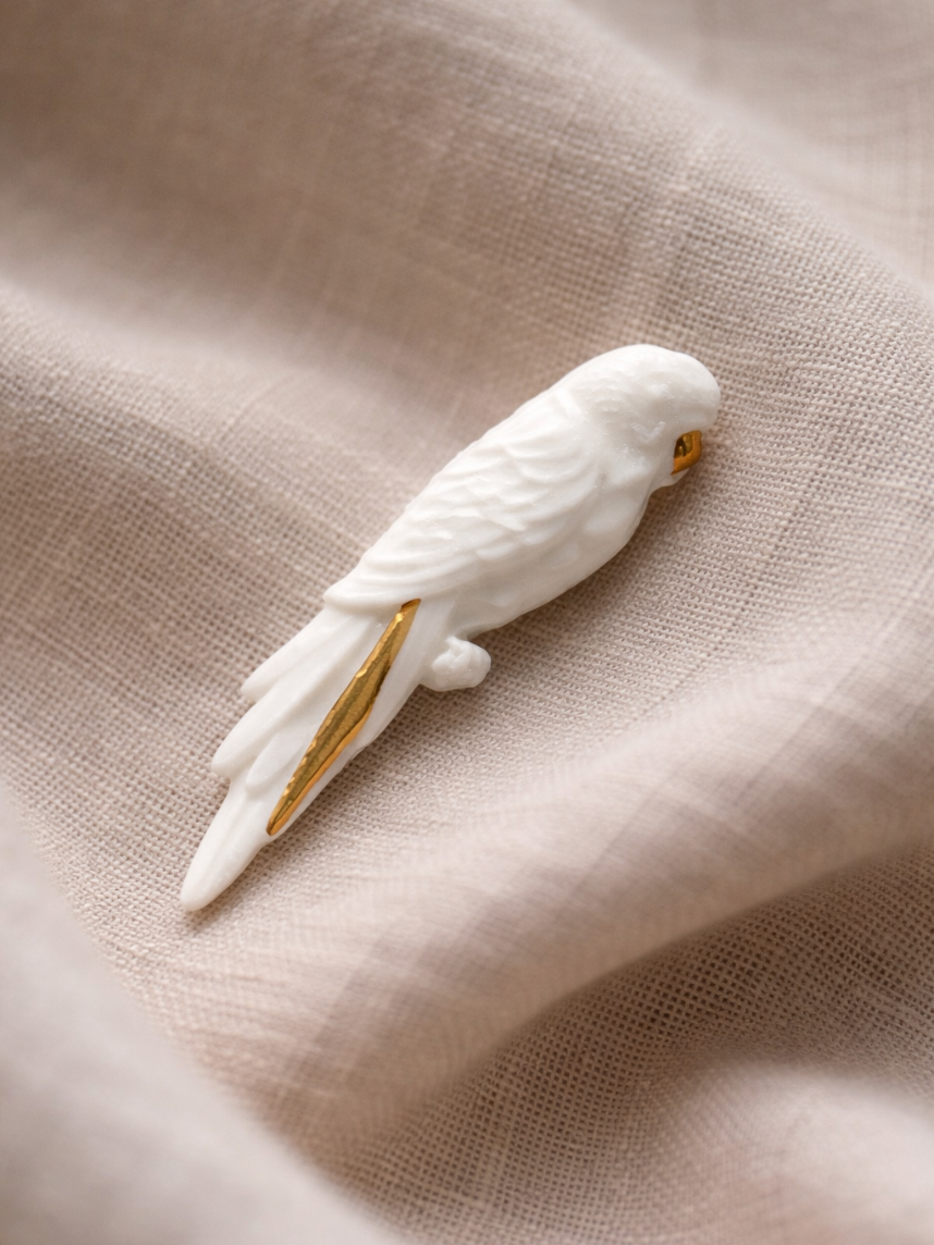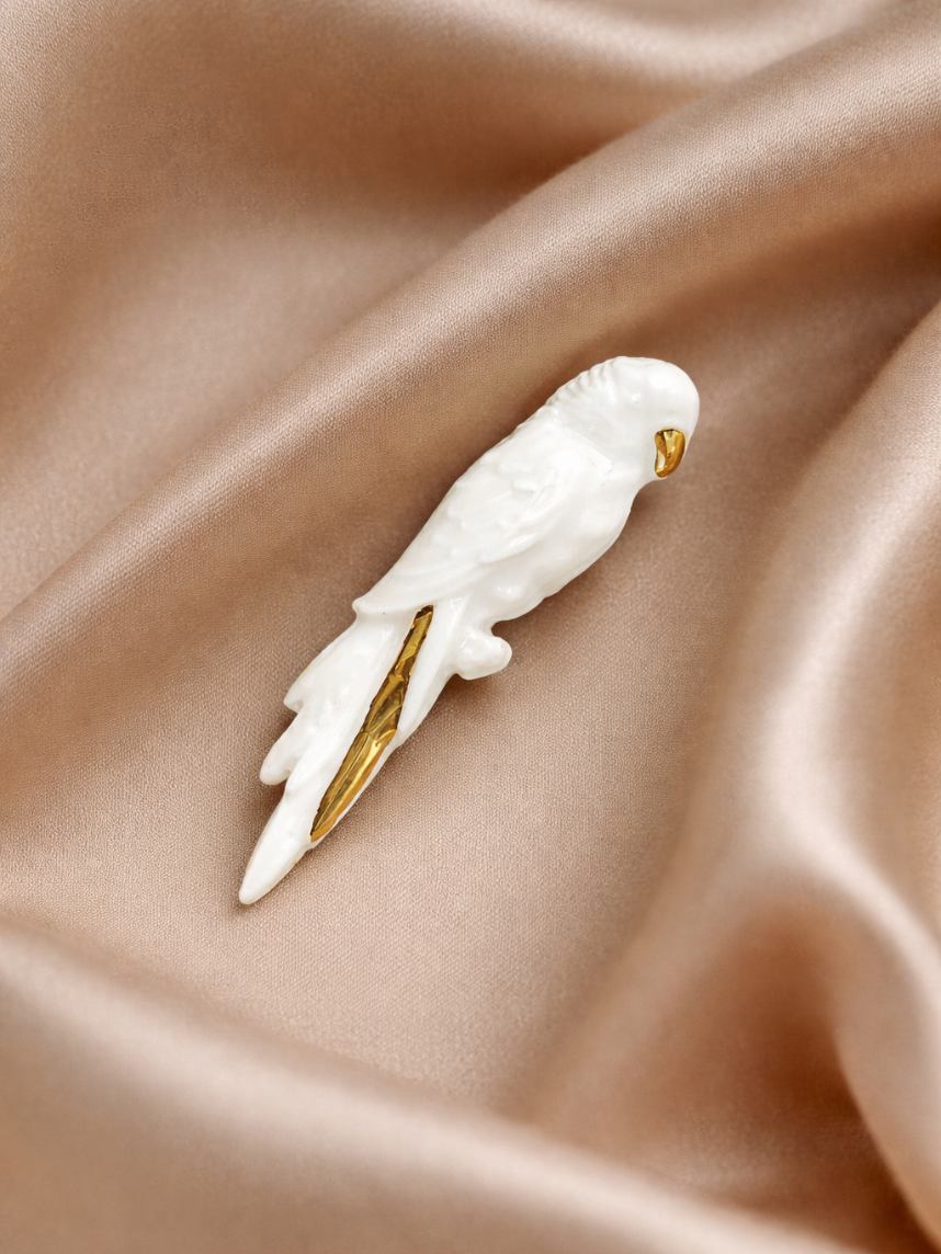 Фарфоровая брошь «Попугай» в бело-золотистом цвете.