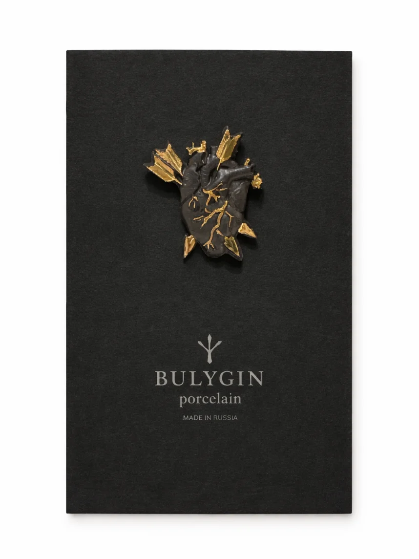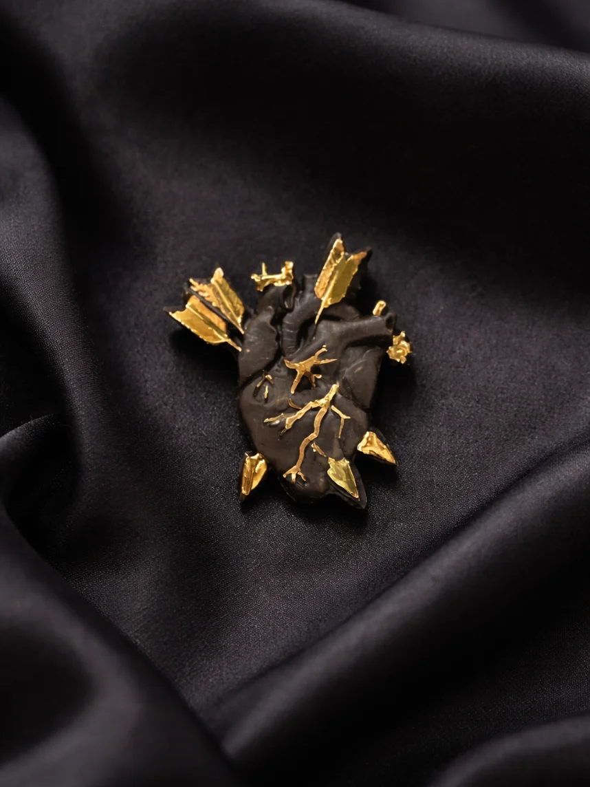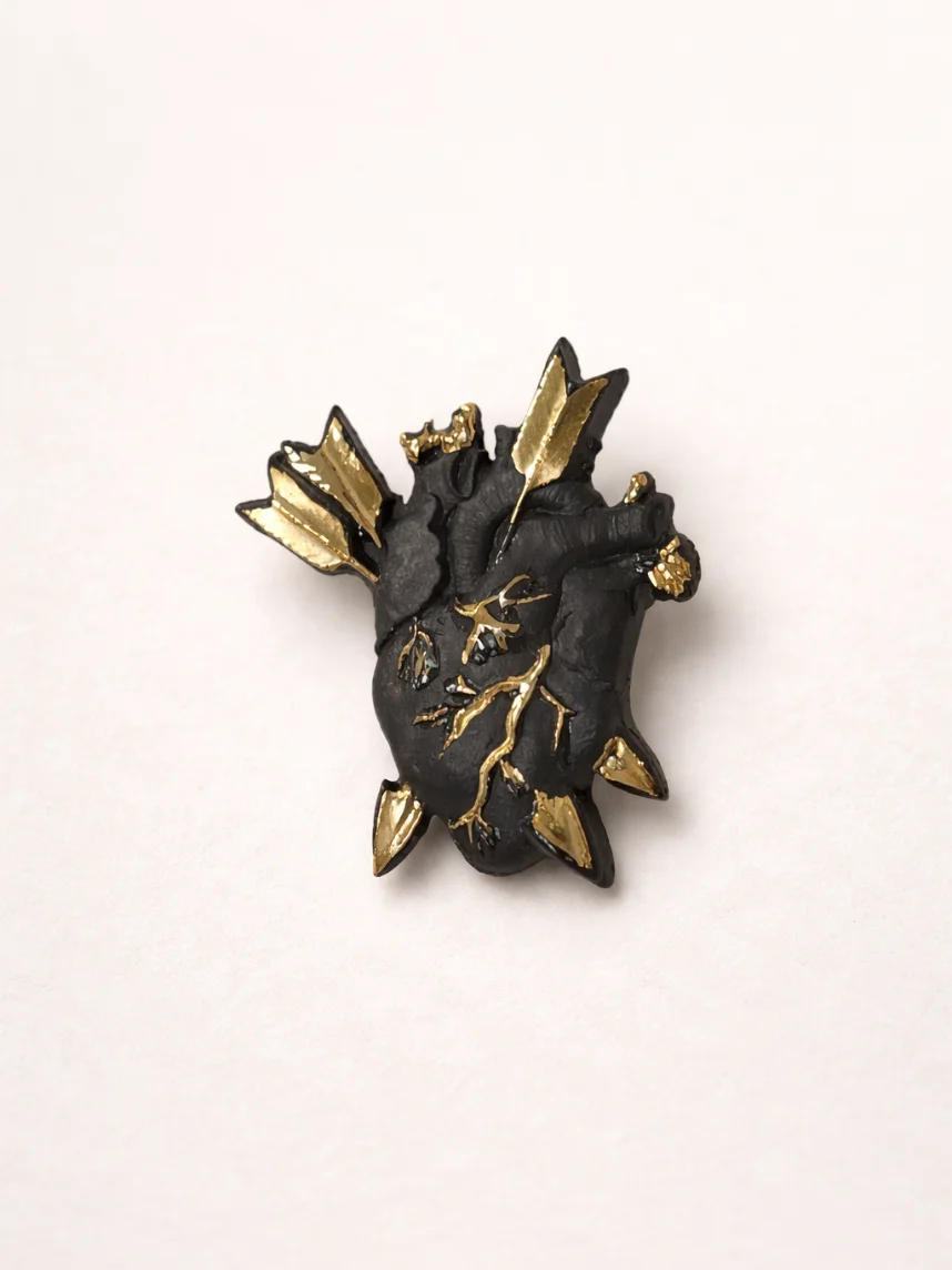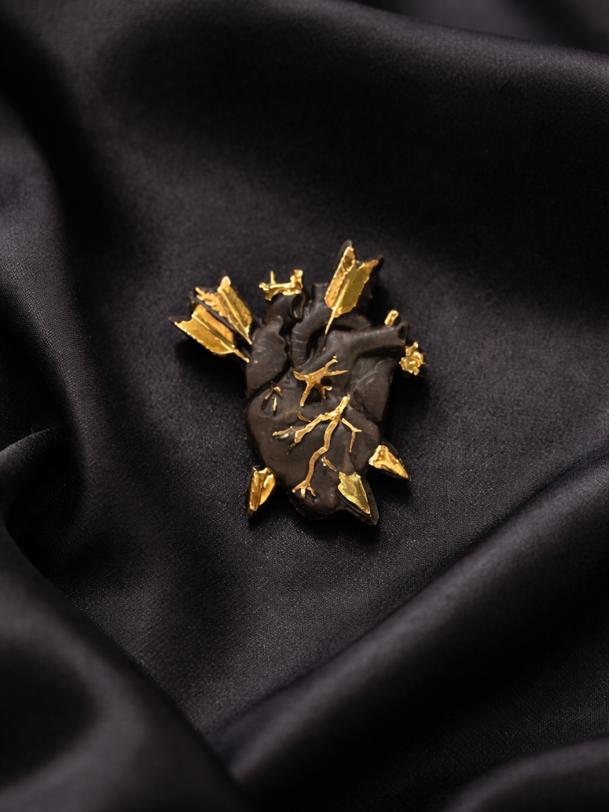 Фарфоровая брошь «Разбитое сердце» в чёрно-золотистом цвете.