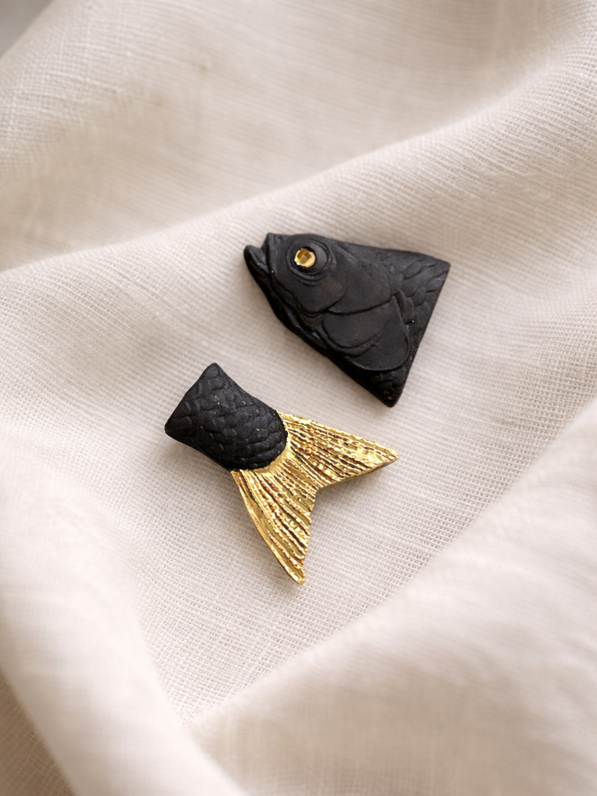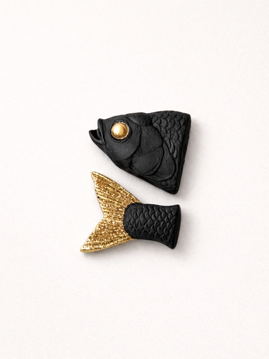Брошь ручной работы Bulygin «Рыбий хвост» большая, фарфор, чёрно-золотистая
