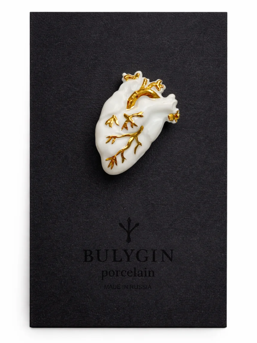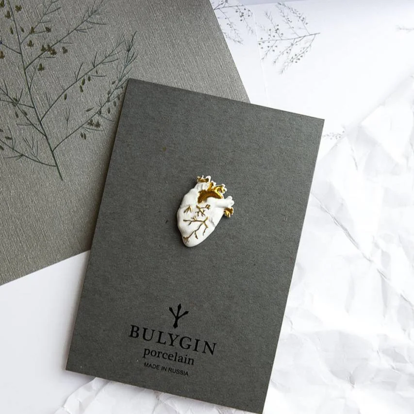Брошь ручной работы Фарфор Булыгина «Сердце», бело-золотистая