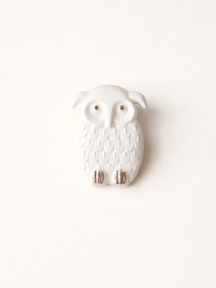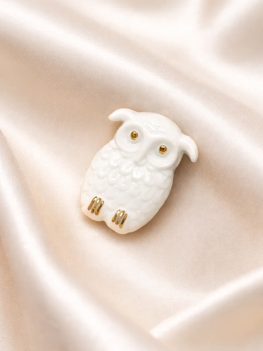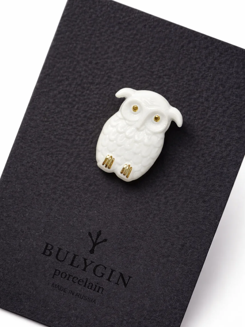 Фарфоровая брошь «Сова» в бело-золотистом цвете.