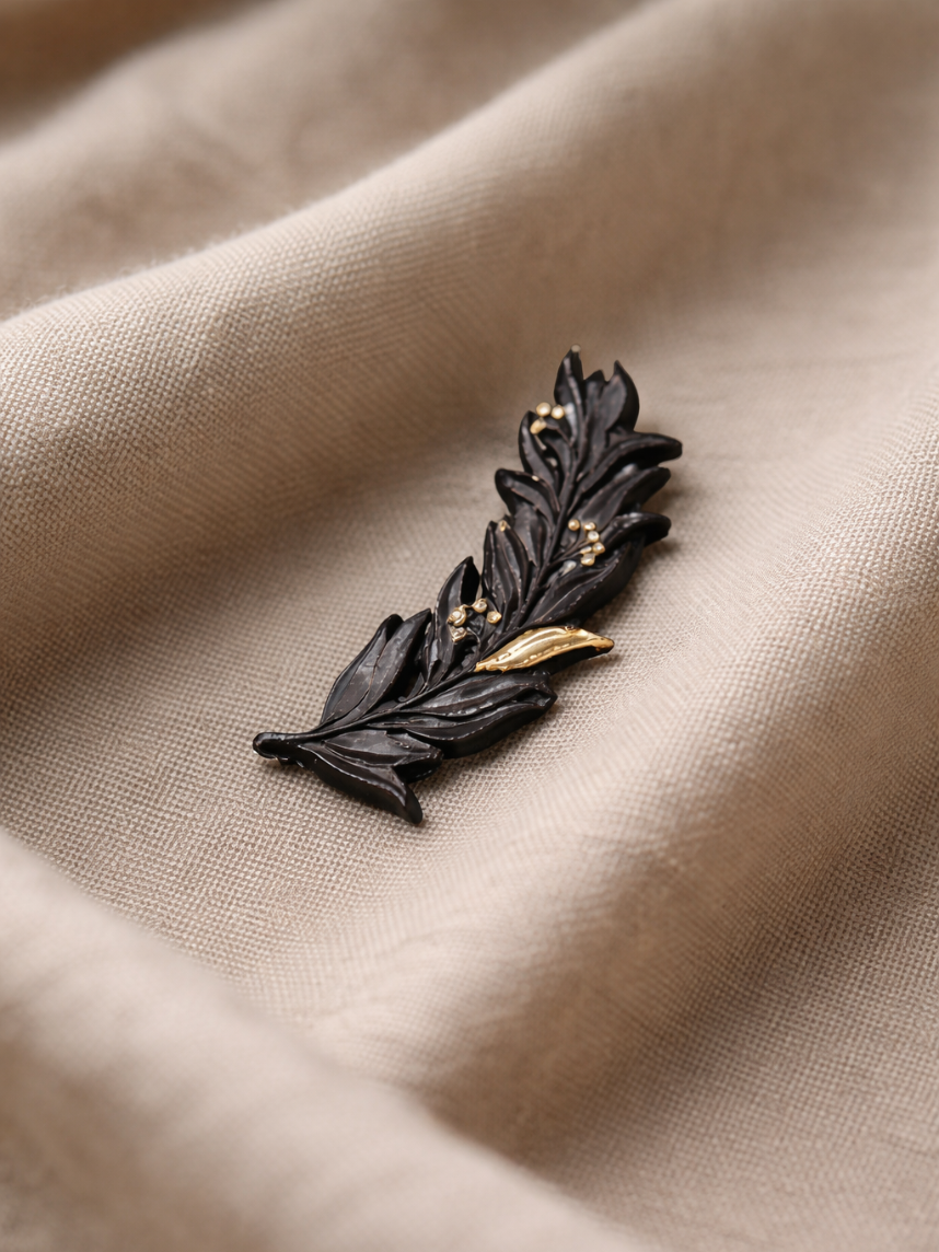 Фарфоровая брошь «Веточка оливы» в чёрно-серебряном цвете.