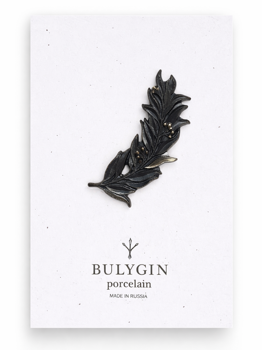 Брошь ручной работы Bulygin «Веточка оливы», фарфор, чёрно-серебристая