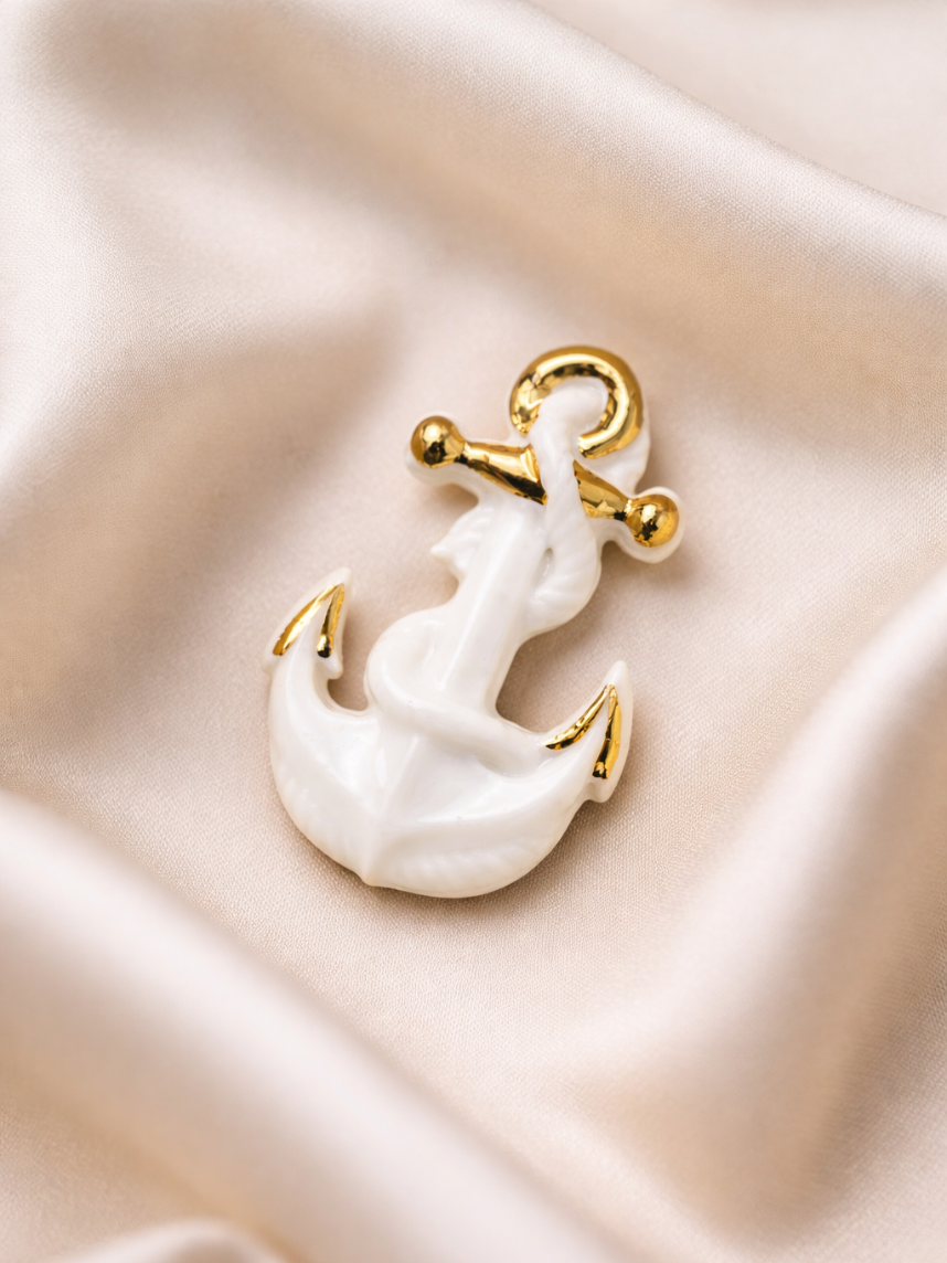 Фарфоровая брошь «Якорь» в бело-золотистом цвете.