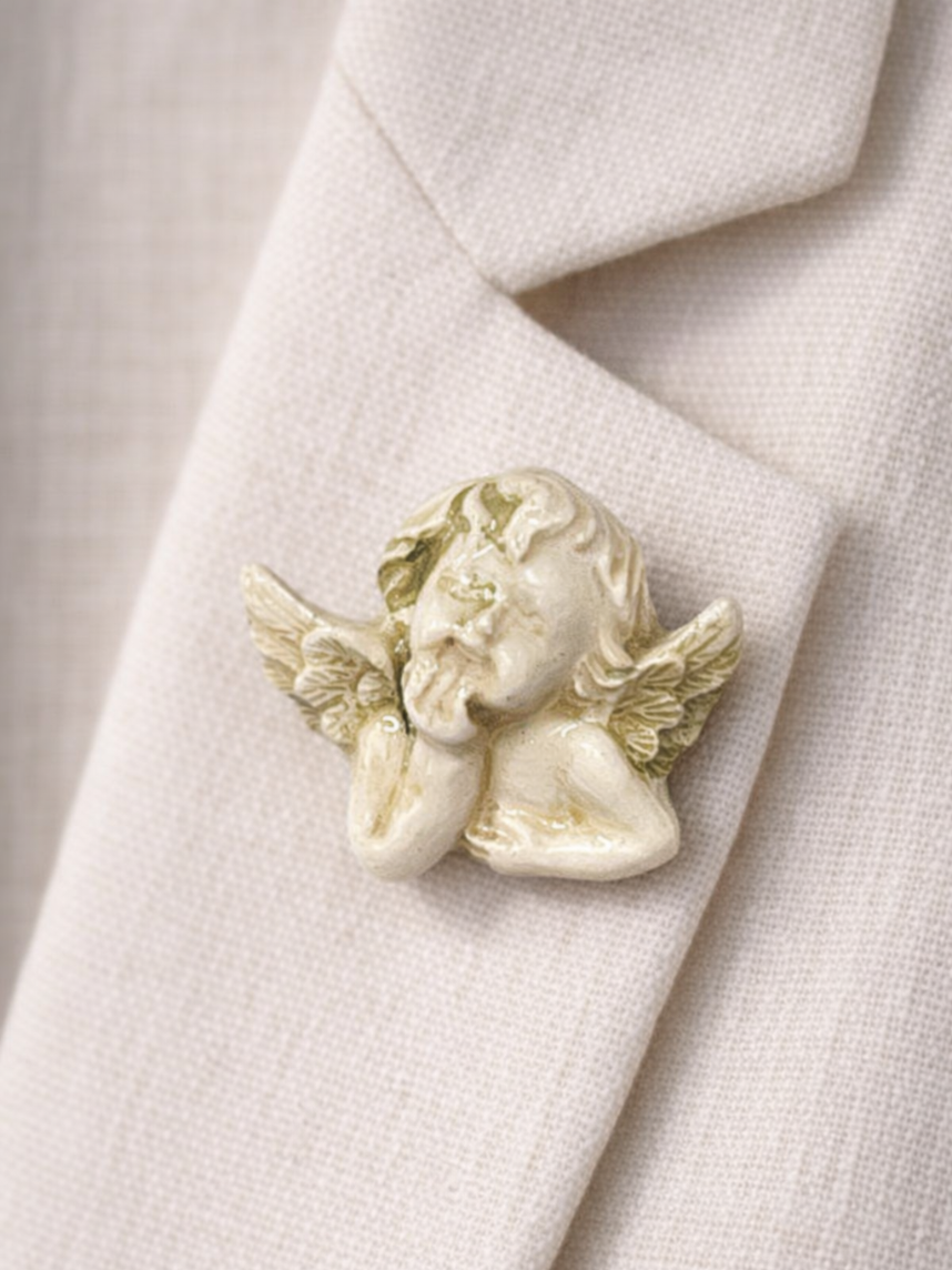 Маленькая аккуратная брошь примерно в виде ангелочка. Органично будет смотреться на вашем пальто, сумке или в качестве элемента декора и подчеркнет вашу индивидуальность.