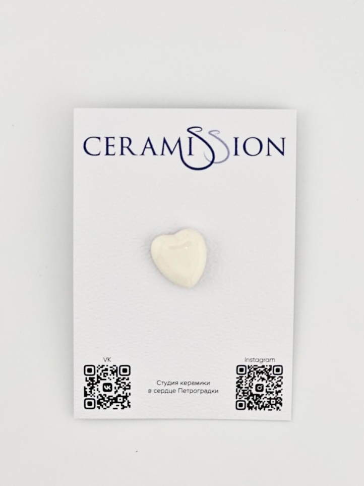 Керамическая брошь «Белое сердечко» от петербургского бренда Ceramission. Ручная работа. Размер броши: 40 х 35 мм, что делает ее заметной и выразительной на одежде или аксессуаре.