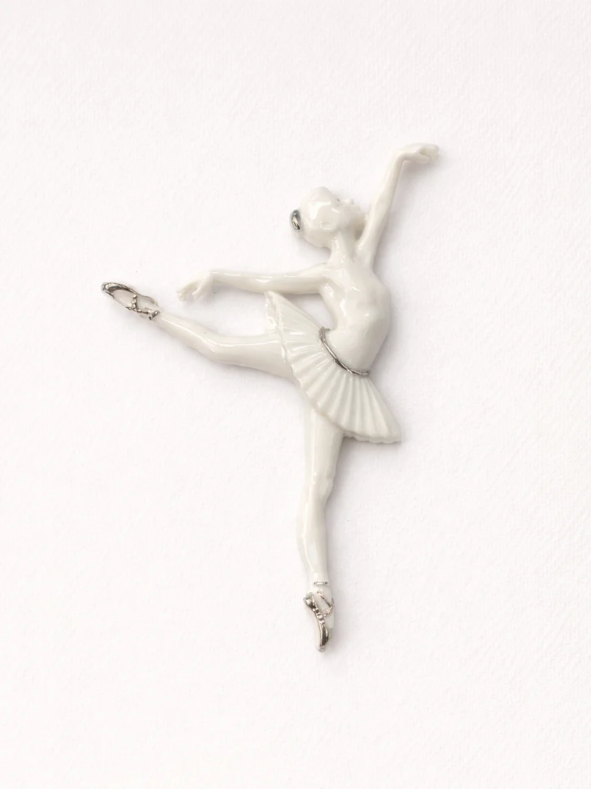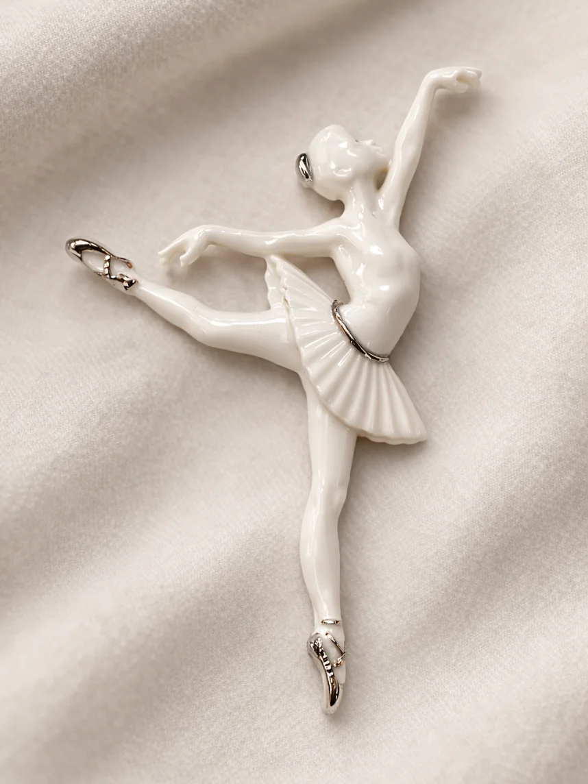 Фарфоровая брошь «Балерина Па №3»  в бело-серебристом цвете.