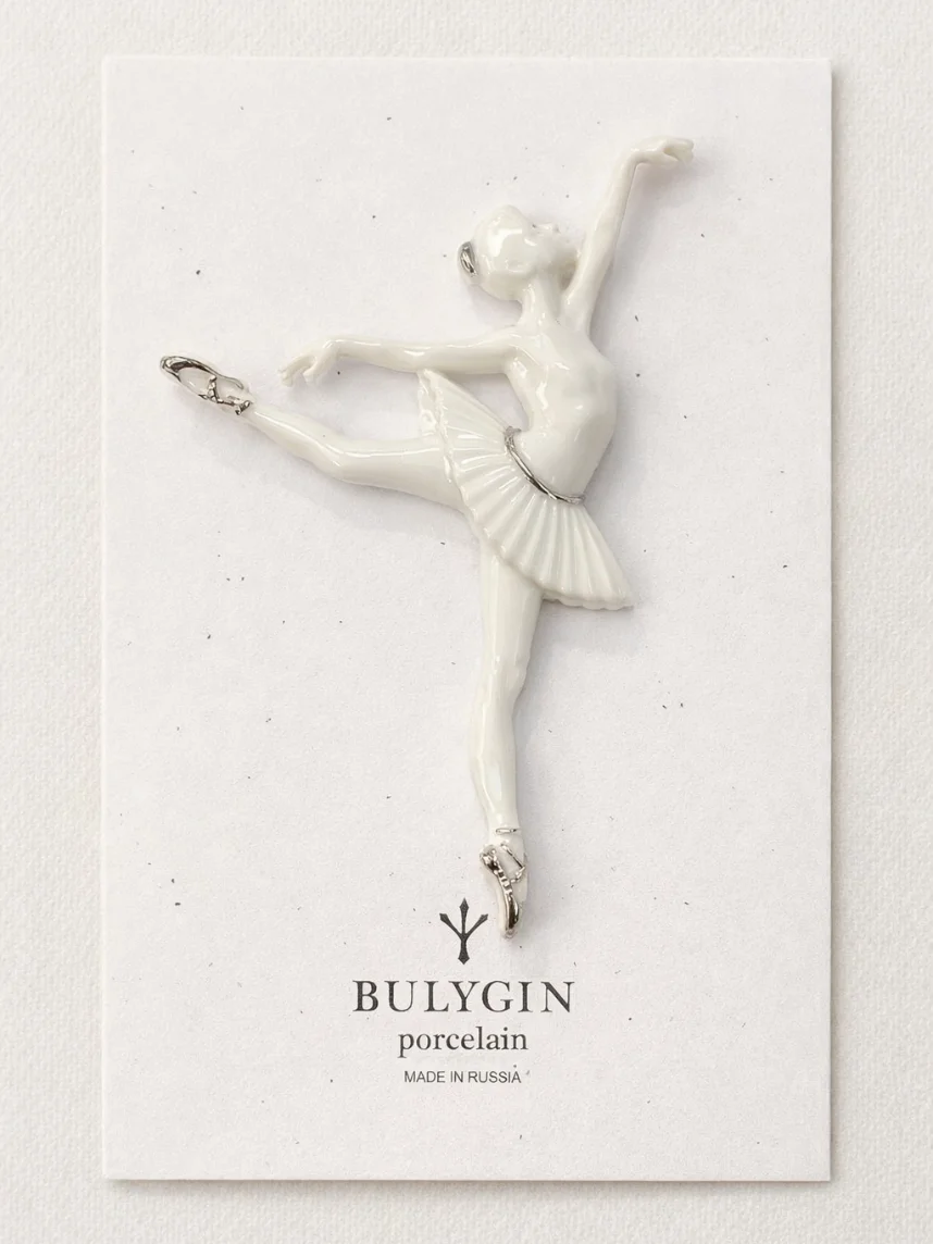 Брошь ручной работы Фарфор Булыгина «Балерина Па №3», бело-серебристая